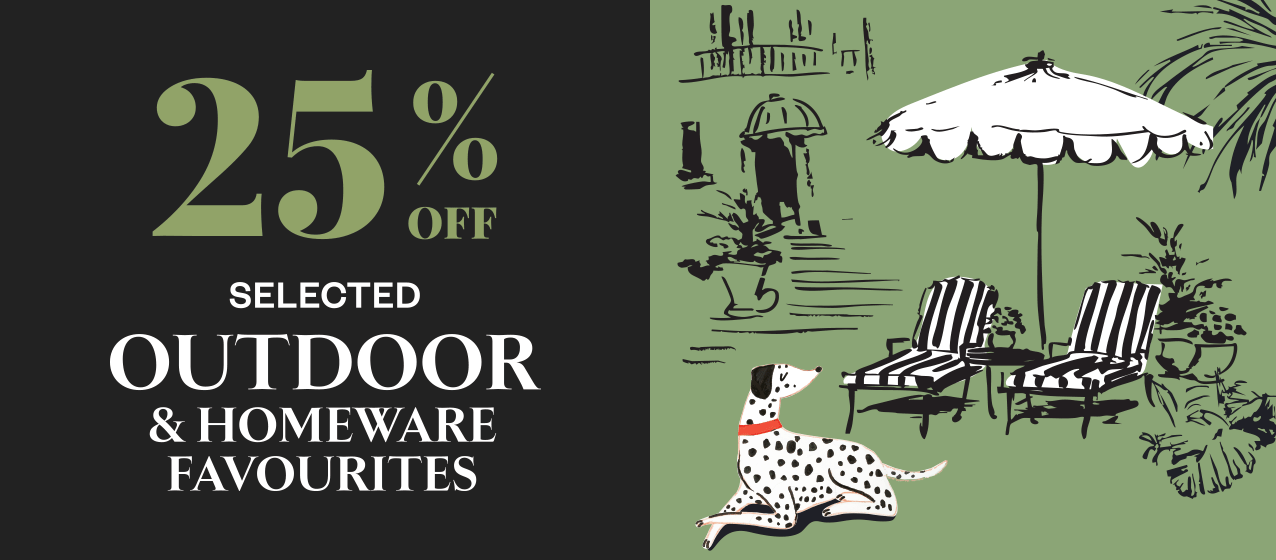 Save 25% on selected outdoor and homeware favourites — chairs, loungers, pots, basketware and more. New deals drop every week. Sale ends 1 December. Ts & Cs apply. Valid while stocks last.