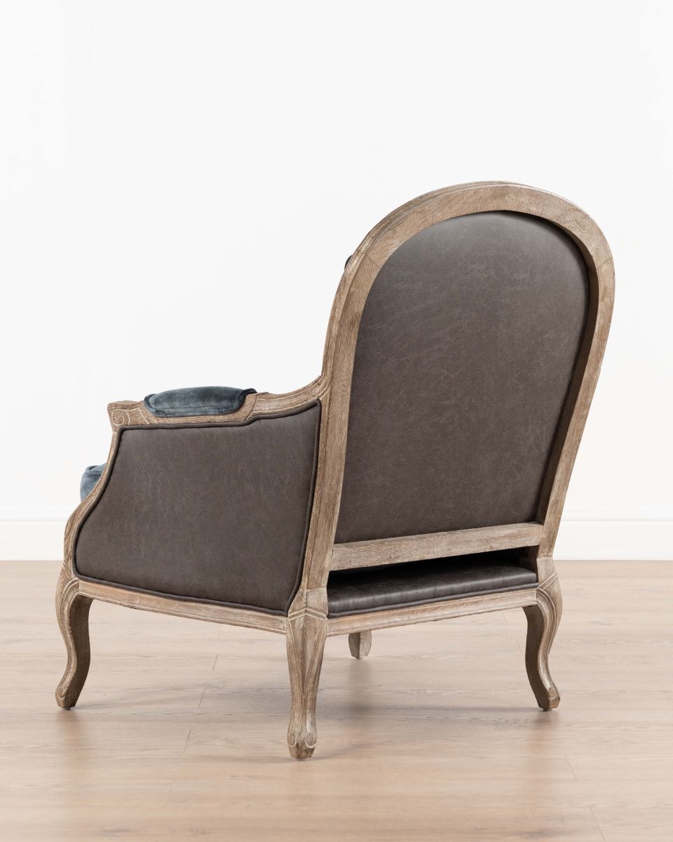 Classic contouring, a combination of velvet upholstery and the comfort of plush cushioning combine to create the Chateau Penelope accent armchair. Detailed frame in distressed oak wood finish celebrates this timeless design.