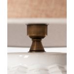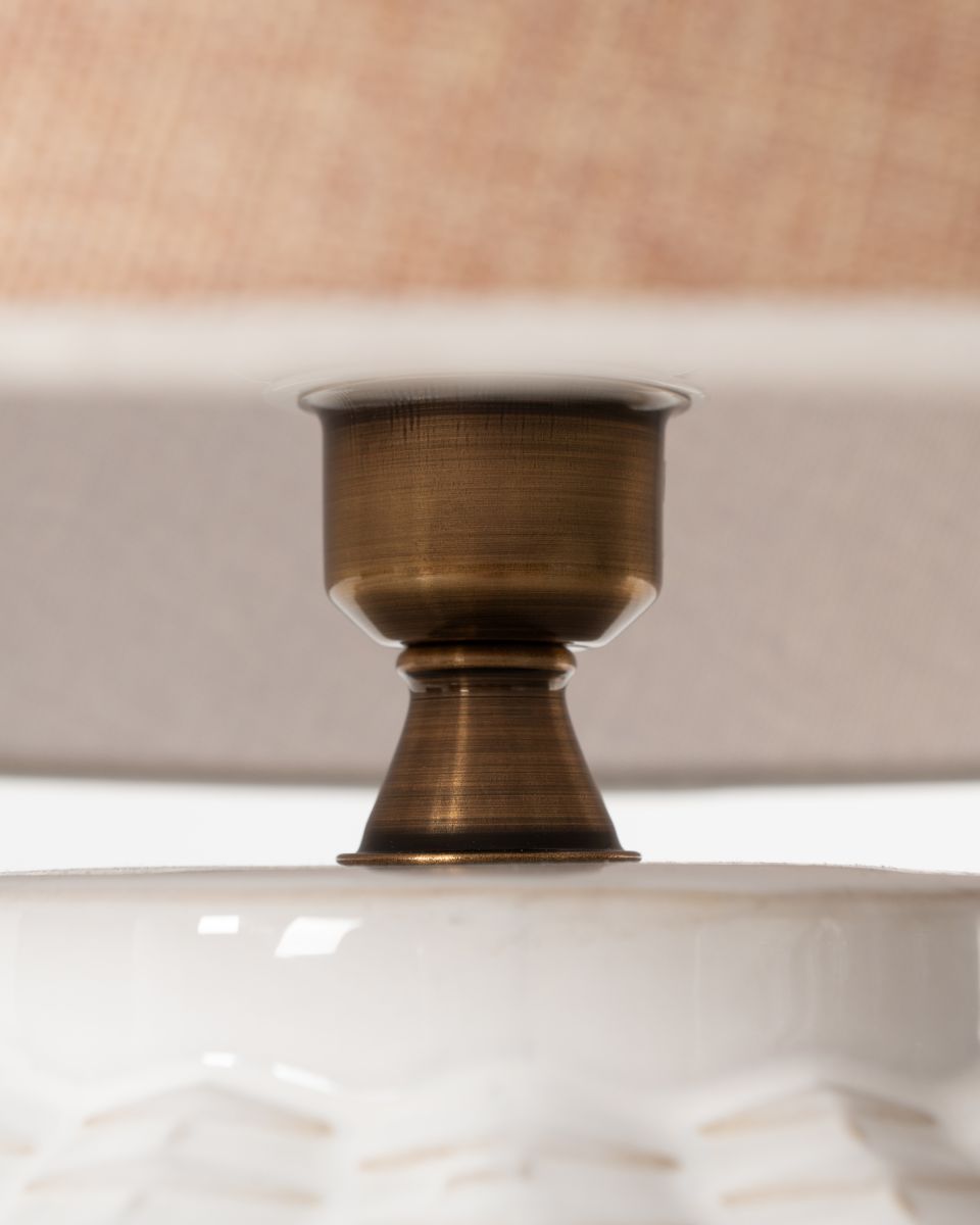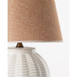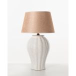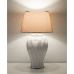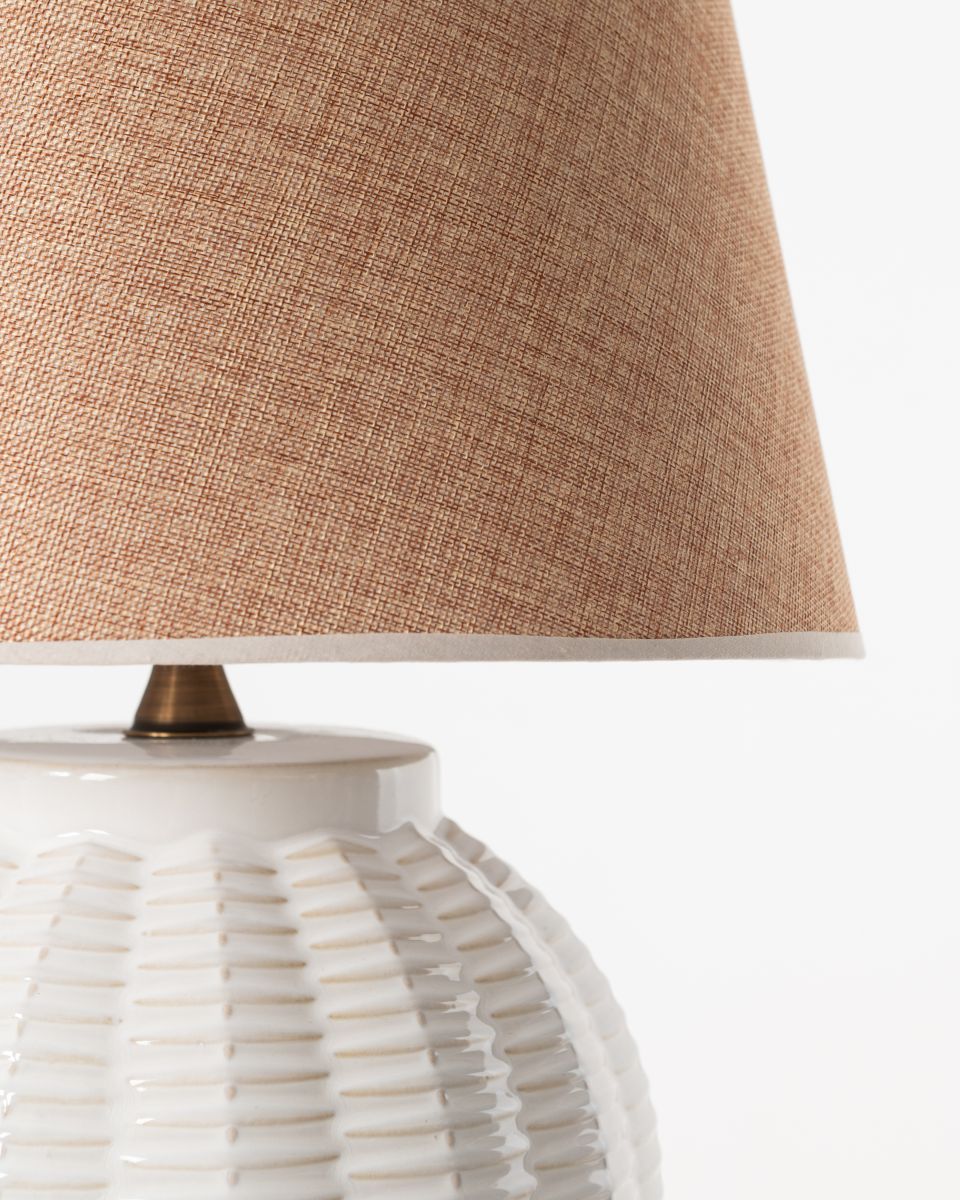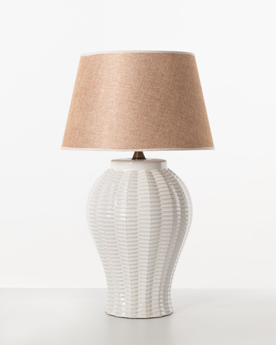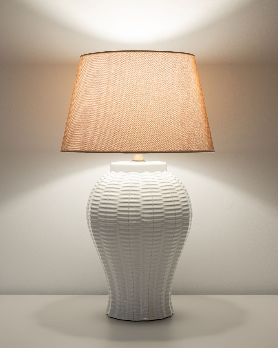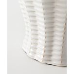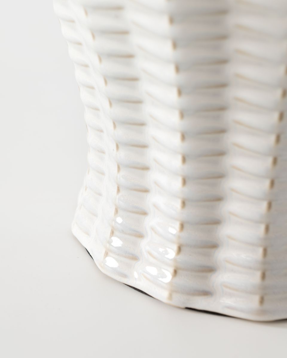 - Features a gently curved, glazed ceramic base with a subtle, woven-like texture in a crisp white finish