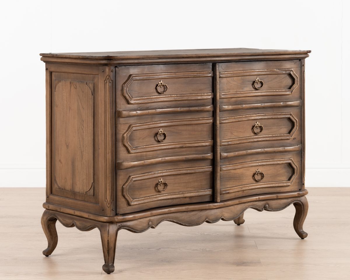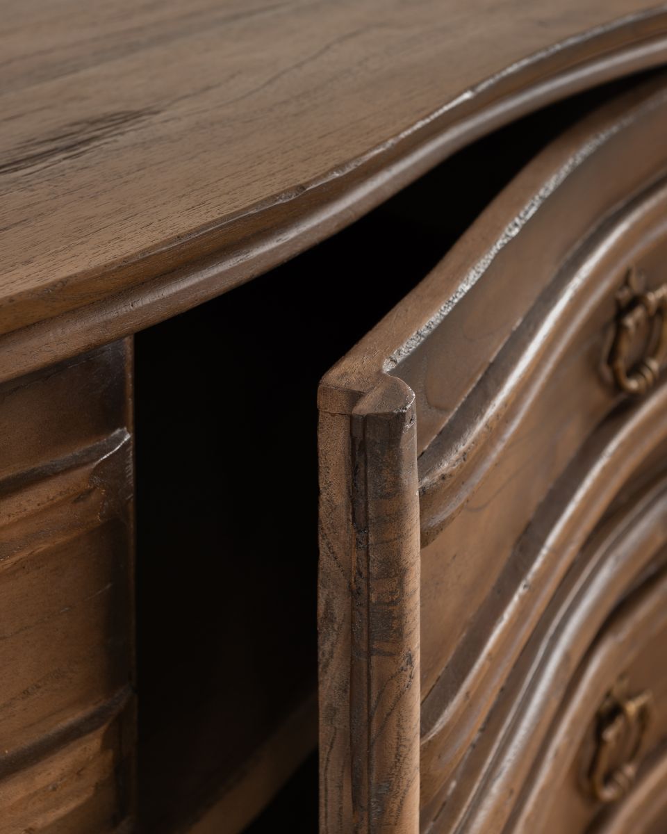The Amiens buffet is a statement piece from the Chateau collection, crafted from mindi wood with a walnut finish. Its generous size offers ample storage, making it perfect as a large bedside table in a spacious bedroom or as a chest of drawers for a TV. This functional and decorative piece works well against any wall for additional storage. Position it in a living room or master bedroom for an elegant touch, or enhance its classical features by pairing it with sophisticated wall art or complementary furnishings.