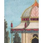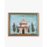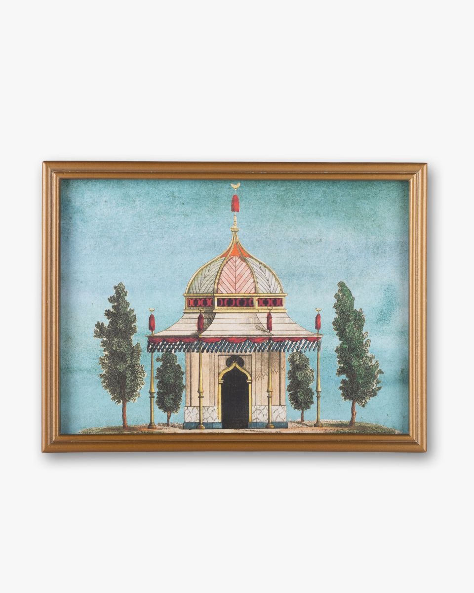 The Architectural Pavilion Wall Art brings an air of architectural elegance into your space. Featuring a finely detailed illustration of a pavilion with a soft, aqua background, it's a striking focal point for any wall. The ornate roof and Moorish-inspired arches with delicate details in red and gold help capture the refined charm of historical drawings in this print. Complete with a wooden frame in a gold finish, it's a bold yet elegant piece that works wonderfully as a standalone piece or as part of a curated gallery wall. Ideal for living areas, hallways, bedrooms or studies.