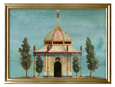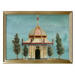 The Architectural Pavilion Wall Art brings an air of architectural elegance into your space. Featuring a finely detailed illustration of a pavilion with a soft, aqua background, it's a striking focal point for any wall. The ornate roof and Moorish-inspired arches with delicate details in red and gold help capture the refined charm of historical drawings in this print.  Complete with a wooden frame in a gold finish, it's a bold yet elegant piece that works wonderfully as a standalone piece or as part of a curated gallery wall. Ideal for living areas, hallways, bedrooms or studies.