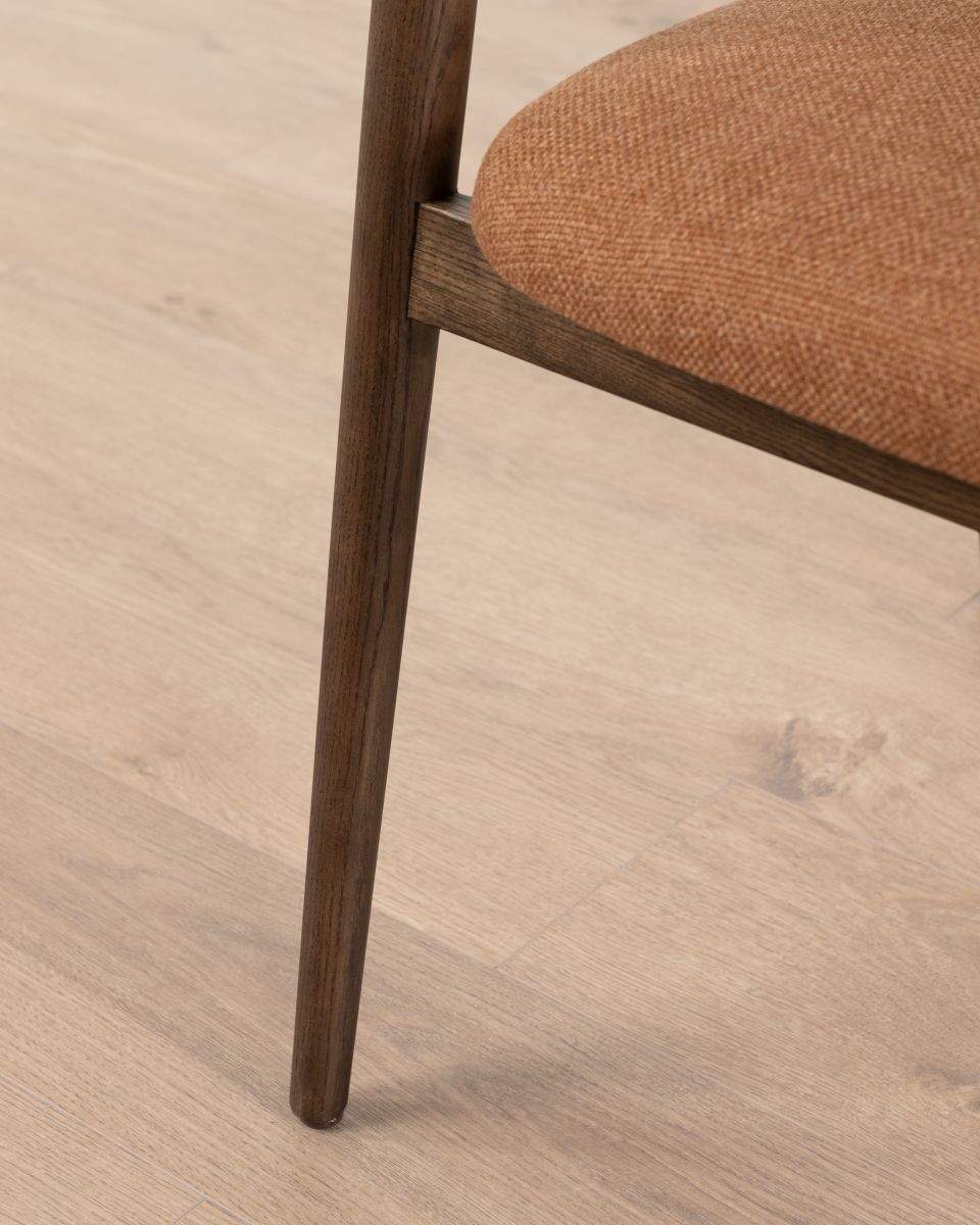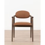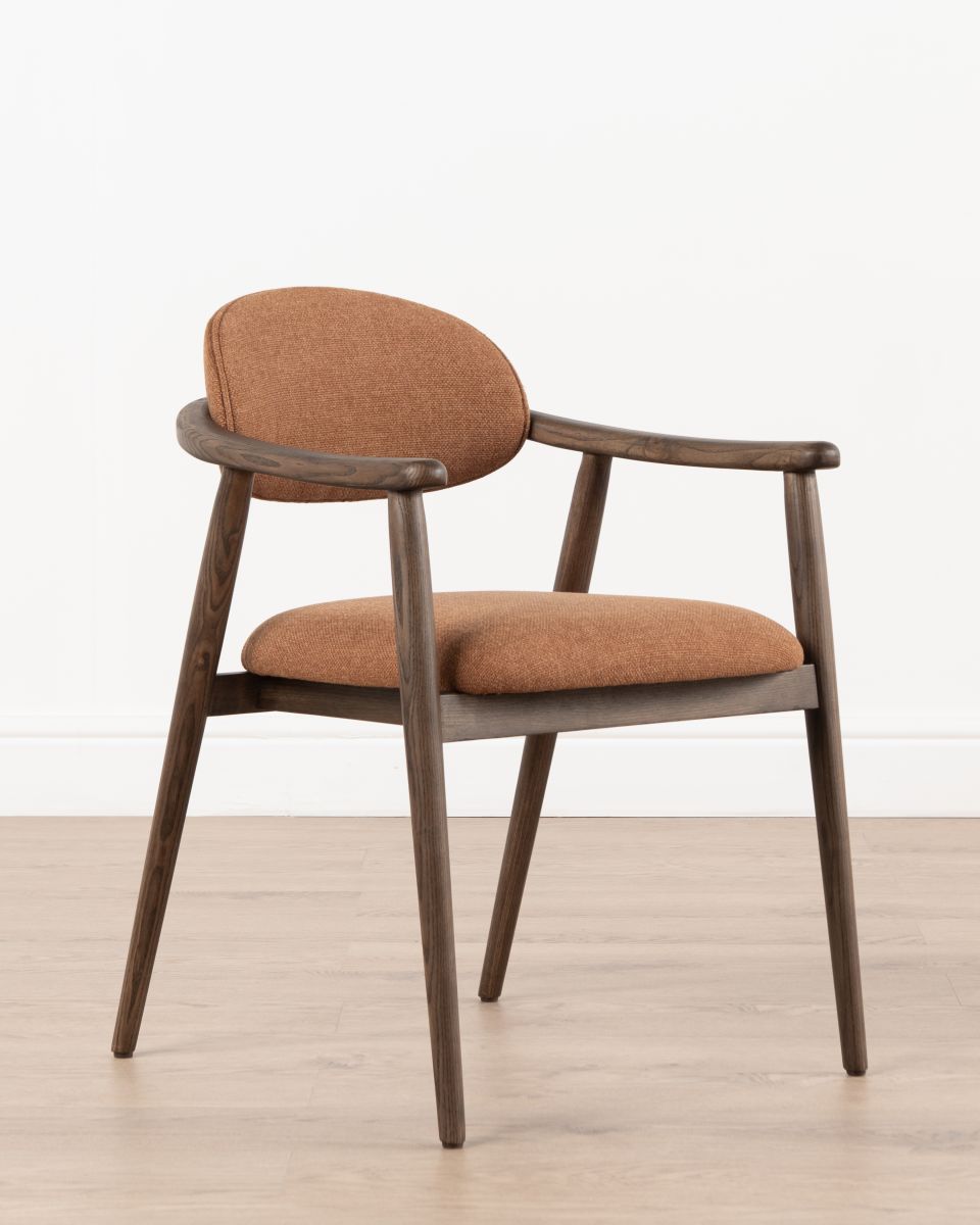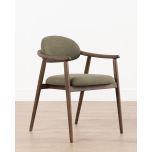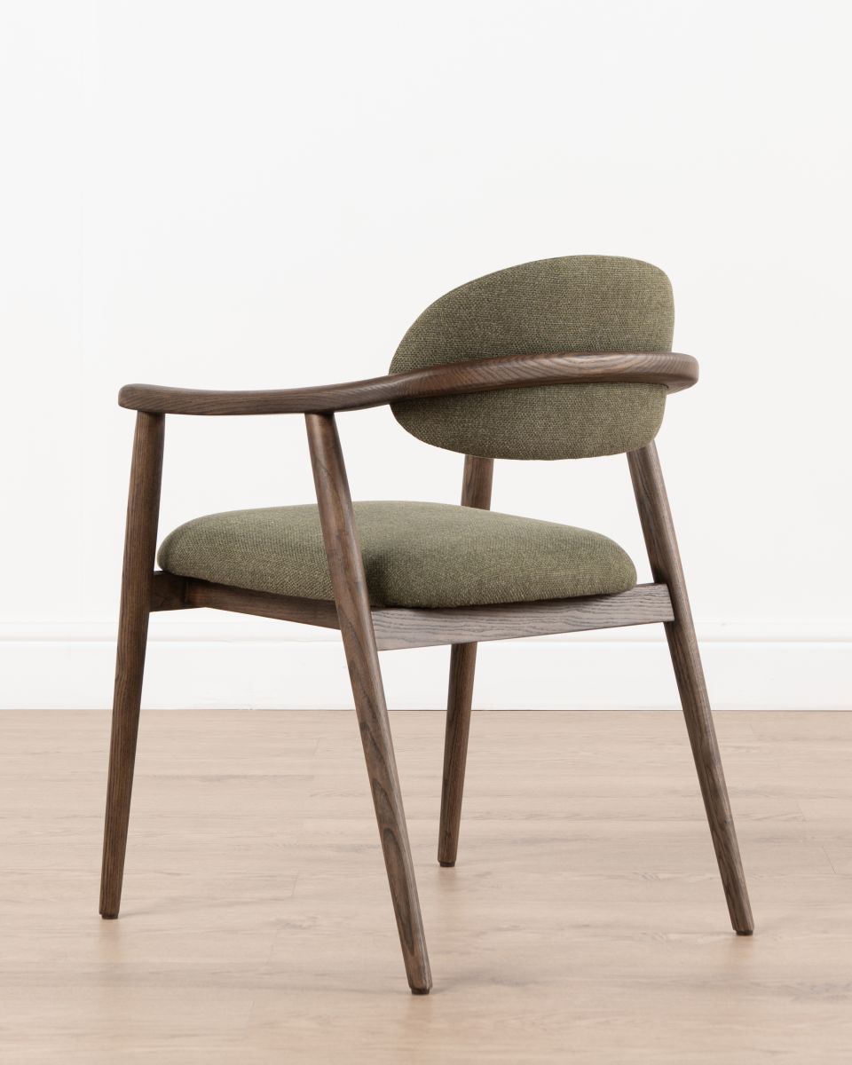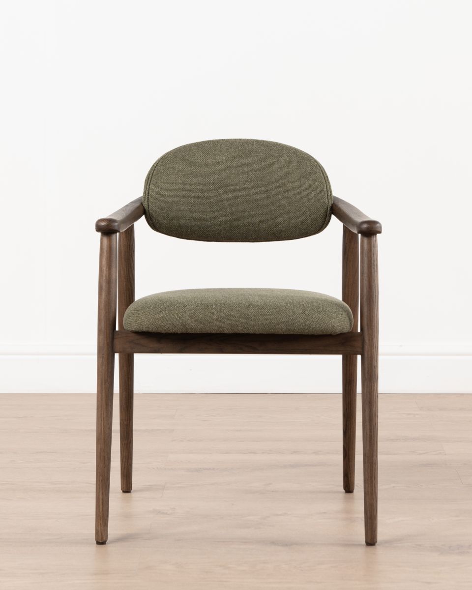 Blending mid-century elegance with modern comfort, the Astoria Dining Chair from our Ebony Collection is ideal for everyday dining and special occasions. Its sturdy frame is crafted from solid ash wood, showcasing the natural grain patterns in a warm finish. The gently curved backrest and sleek armrests create an inviting silhouette, while the tapered legs provide a light and refined look. The seat and backrest are upholstered in durable fabric for easy maintenance and provide plush, padded comfort.