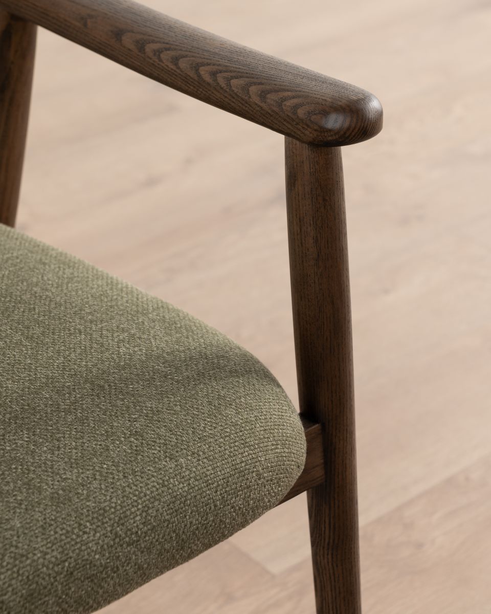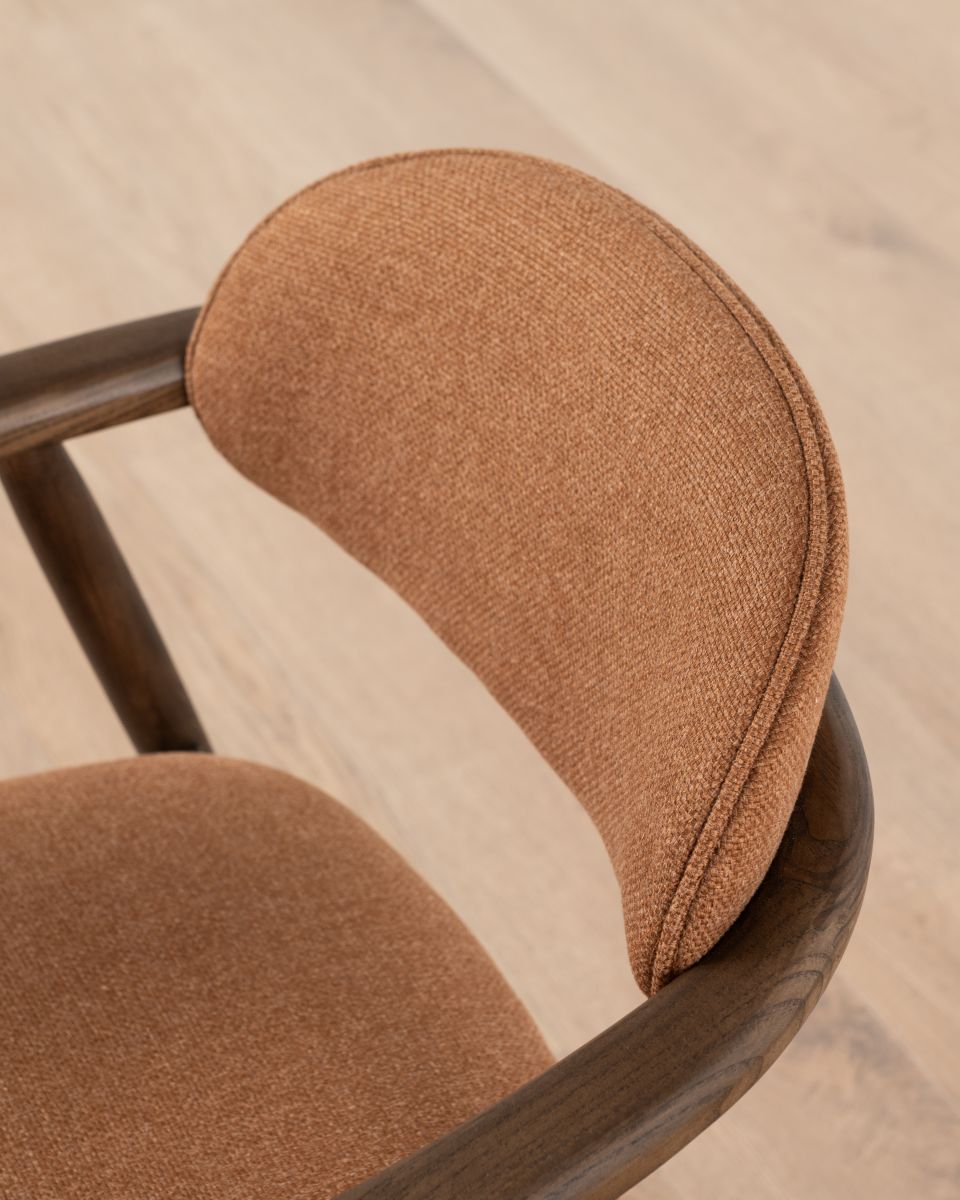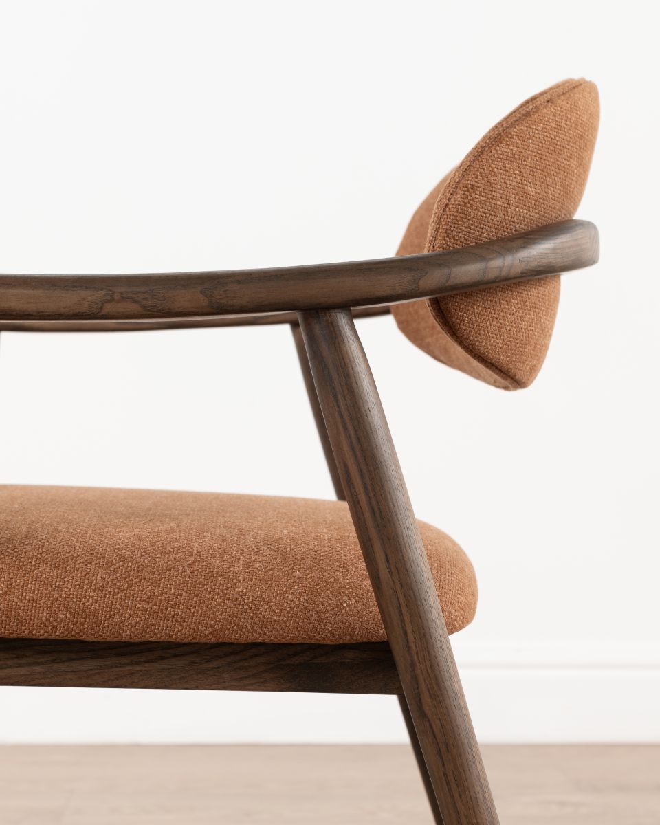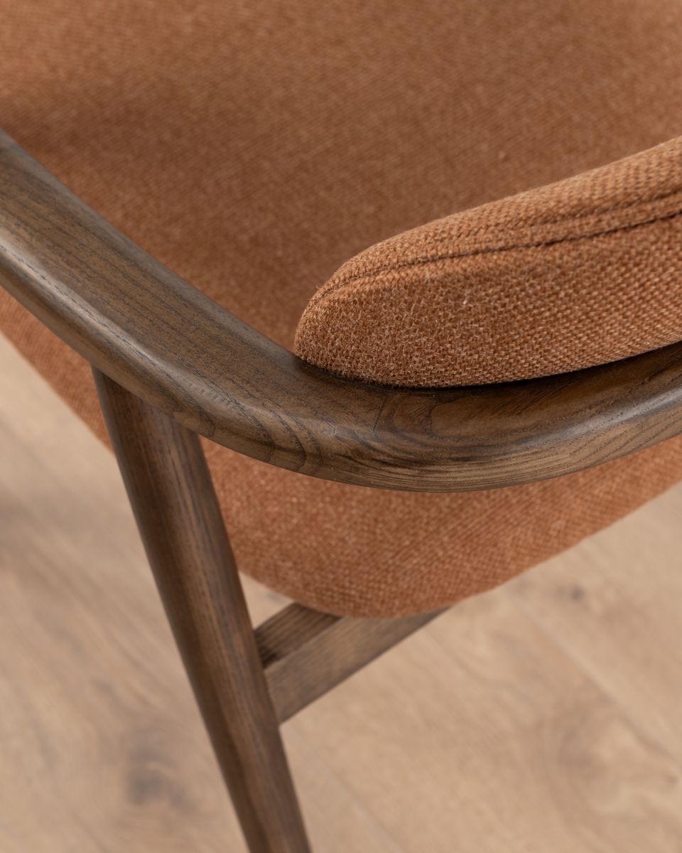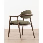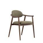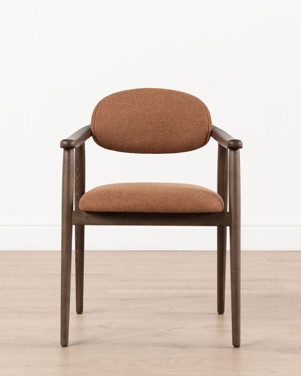 Blending mid-century elegance with modern comfort, the Astoria Dining Chair from our Ebony Collection is ideal for everyday dining and special occasions. Its sturdy frame is crafted from solid ash wood, showcasing the natural grain patterns in a warm finish. The gently curved backrest and sleek armrests create an inviting silhouette, while the tapered legs provide a light and refined look. The seat and backrest are upholstered in durable fabric for easy maintenance and provide plush, padded comfort.