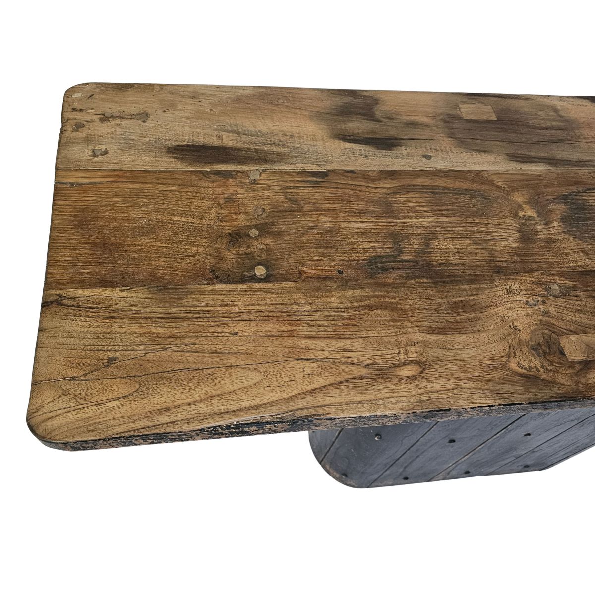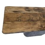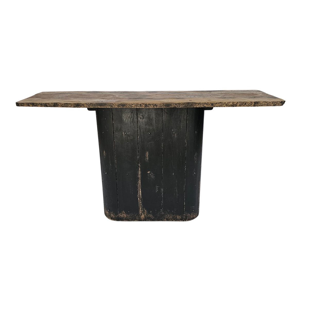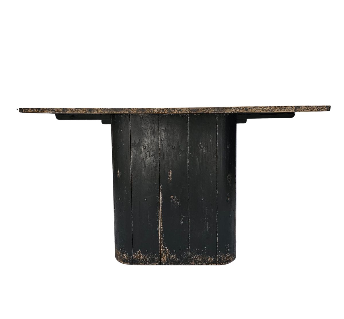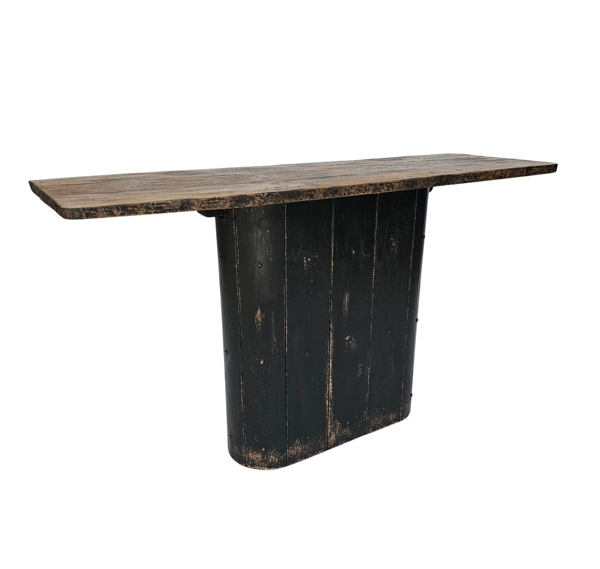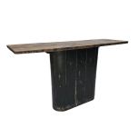 The Beniget console table from the Ebony collection is a striking blend of modern and rustic design. Its detailed top features antique worn edges and a smoky grey charcoal hue, highlighting the organic wood grains with a smooth, flat finish. The oval black wood grooved base adds to its unique appeal, making it a standout piece in any space.