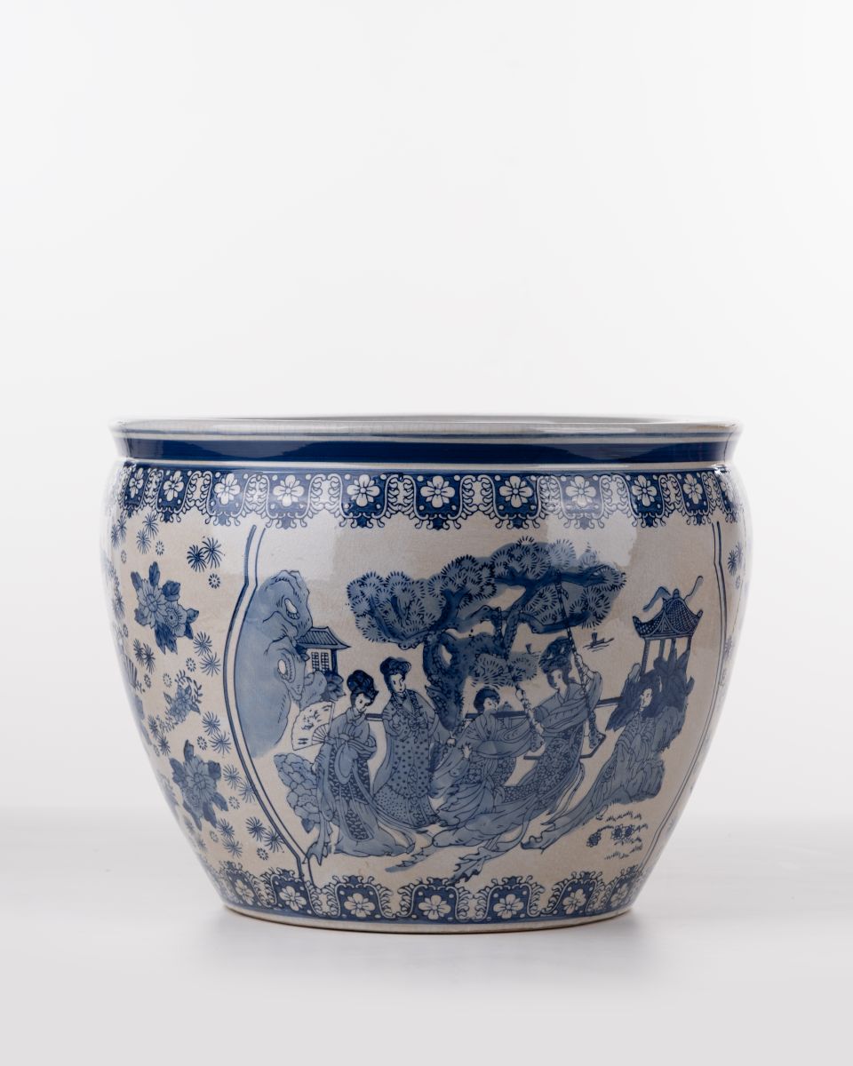 The Blue Dynasty Garden Planter brings timeless artistry into your home with its classic blue-and-white ceramic design. Featuring an intricate hand-painted scene of elegant figures, lush foliage, and traditional architectural motifs, this planter captures the charm and storytelling of historic porcelain craftsmanship.