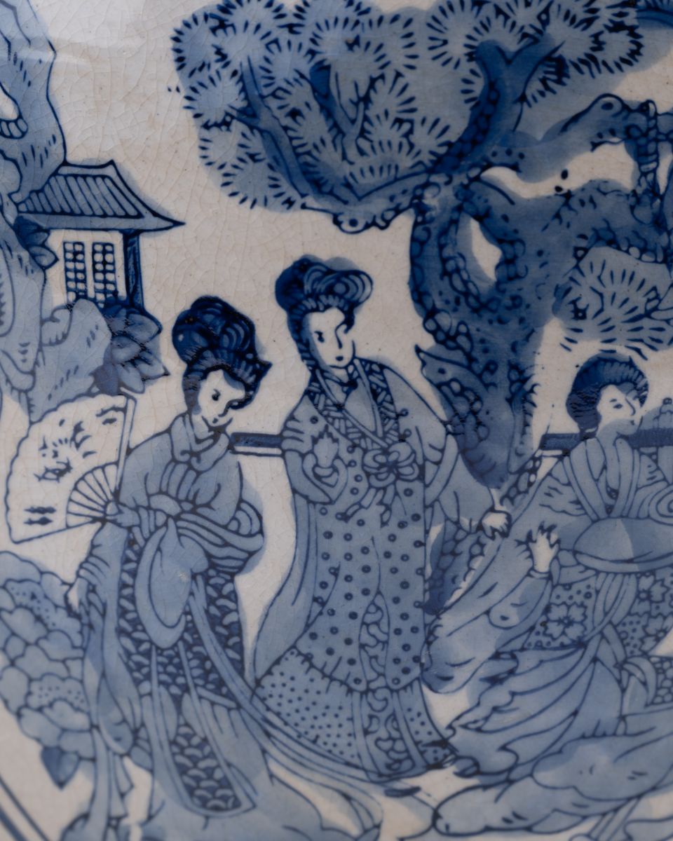 • Detailed blue-and-white landscape and figure motif