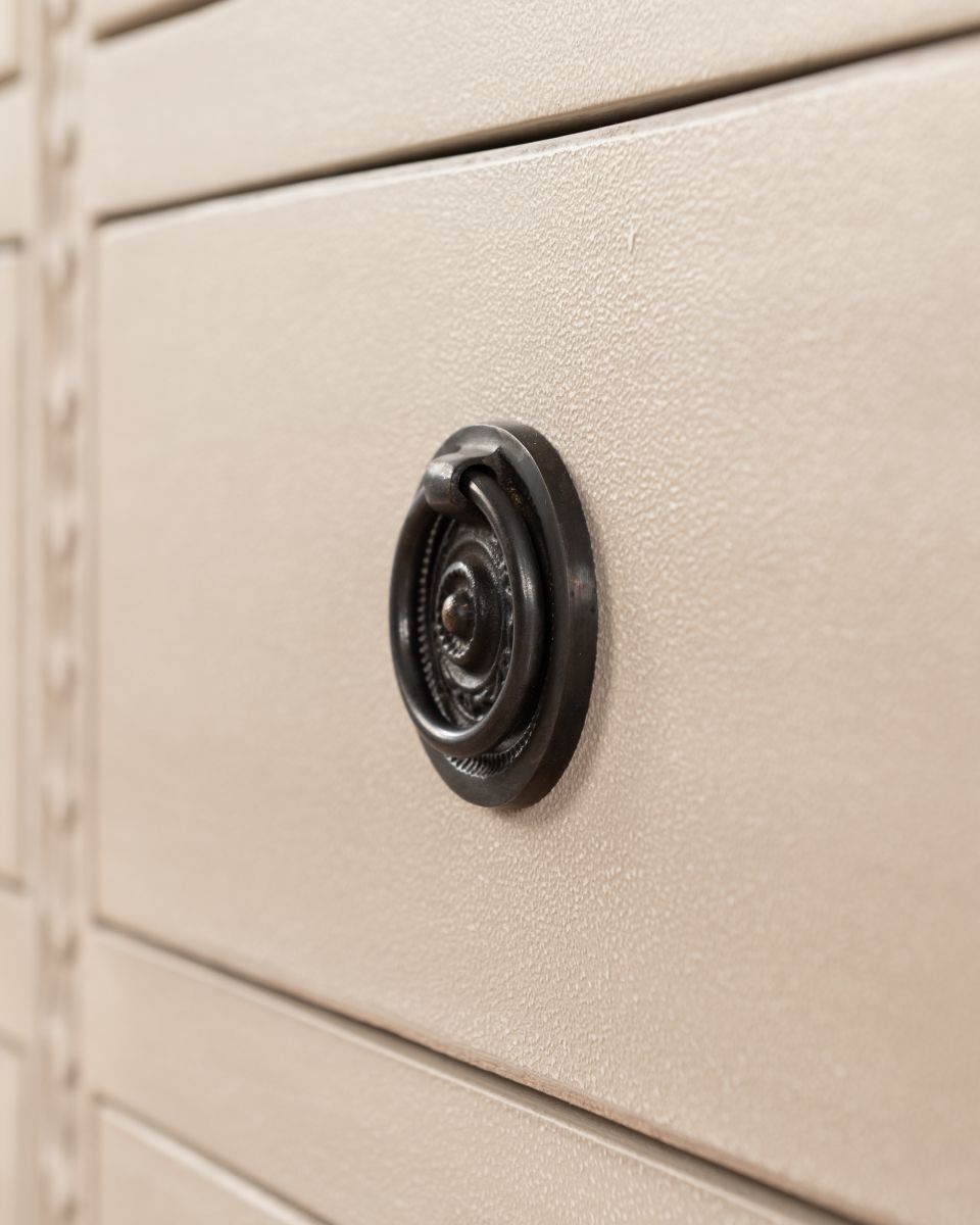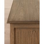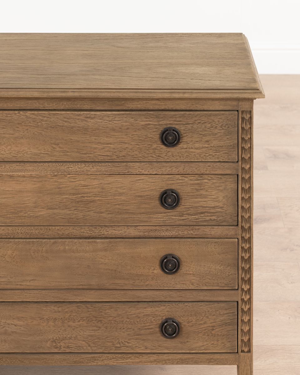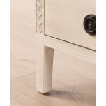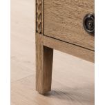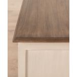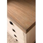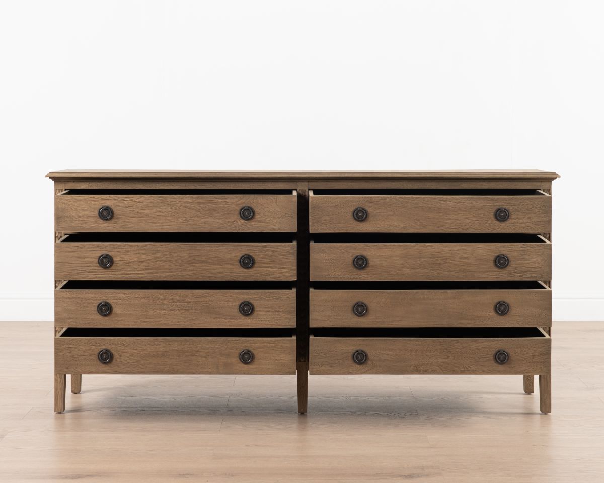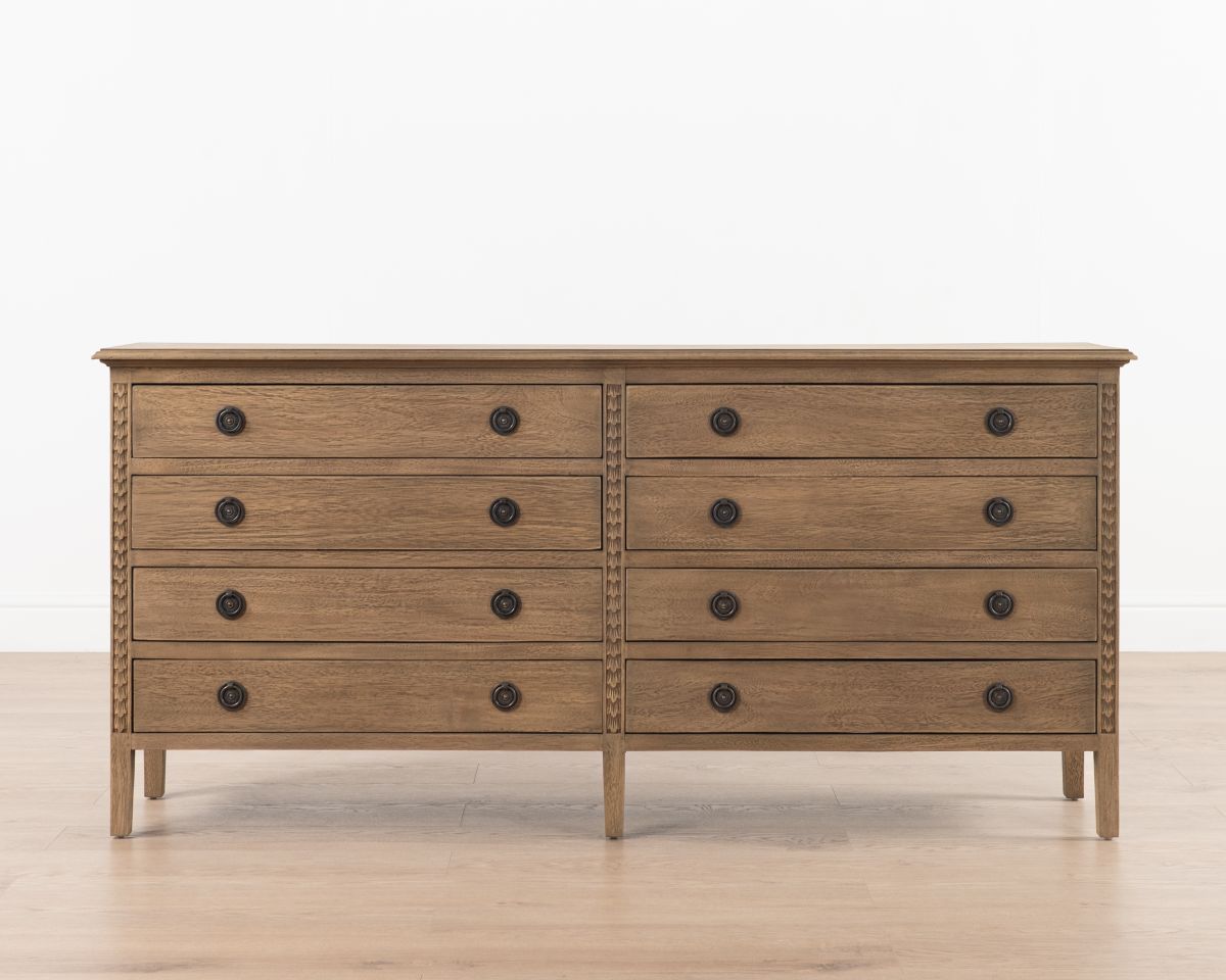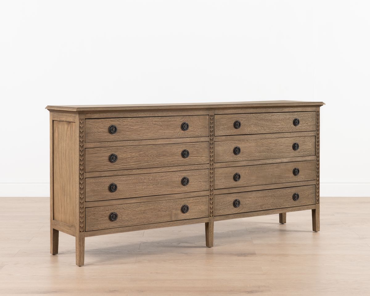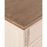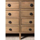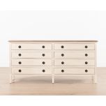 The Bourges sideboard from the Chateau collection, features eight drawers with elegant round metal ring handles. Crafted from bayur wood with a mindi veneer, its narrow design and classic French country painted look make it a perfect choice for dining rooms or large entrance halls. Available in two versatile colours, white and natural, it beautifully combines functionality with timeless style. The sideboard's wood top complements its drop handles, enhancing its classic appeal.