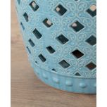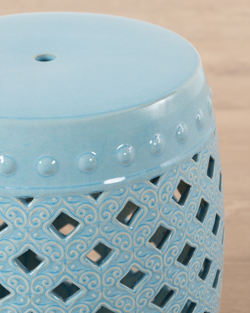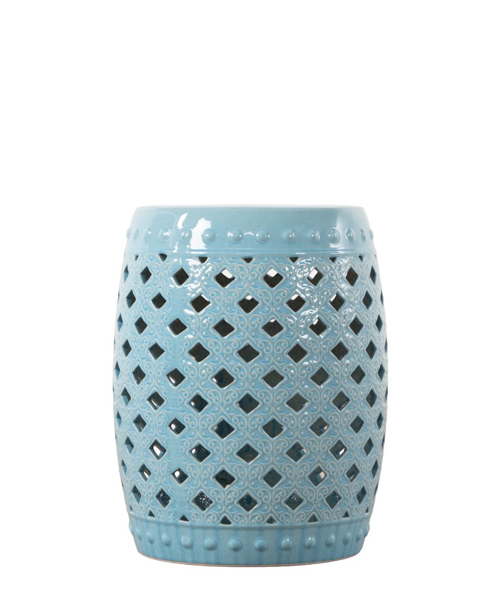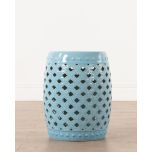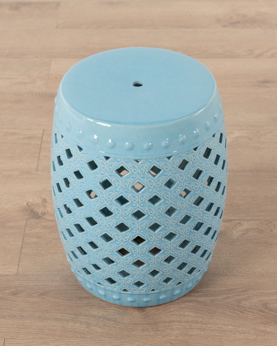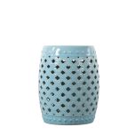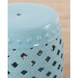 Fresh and decorative, this blue ceramic cut-out stool brings a sense of calm elegance to any interior. Finished in a soft blue glaze, the gently tapered silhouette features an intricate lattice of pierced diamond-shaped cut-outs, framed by subtle raised detailing. The patterned surface creates texture and visual depth, while allowing light to pass through for an airy, sculptural effect.
