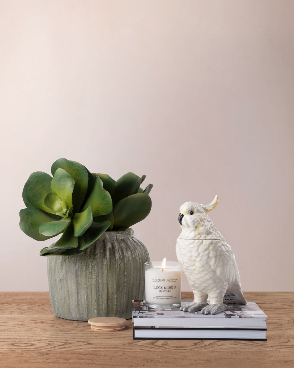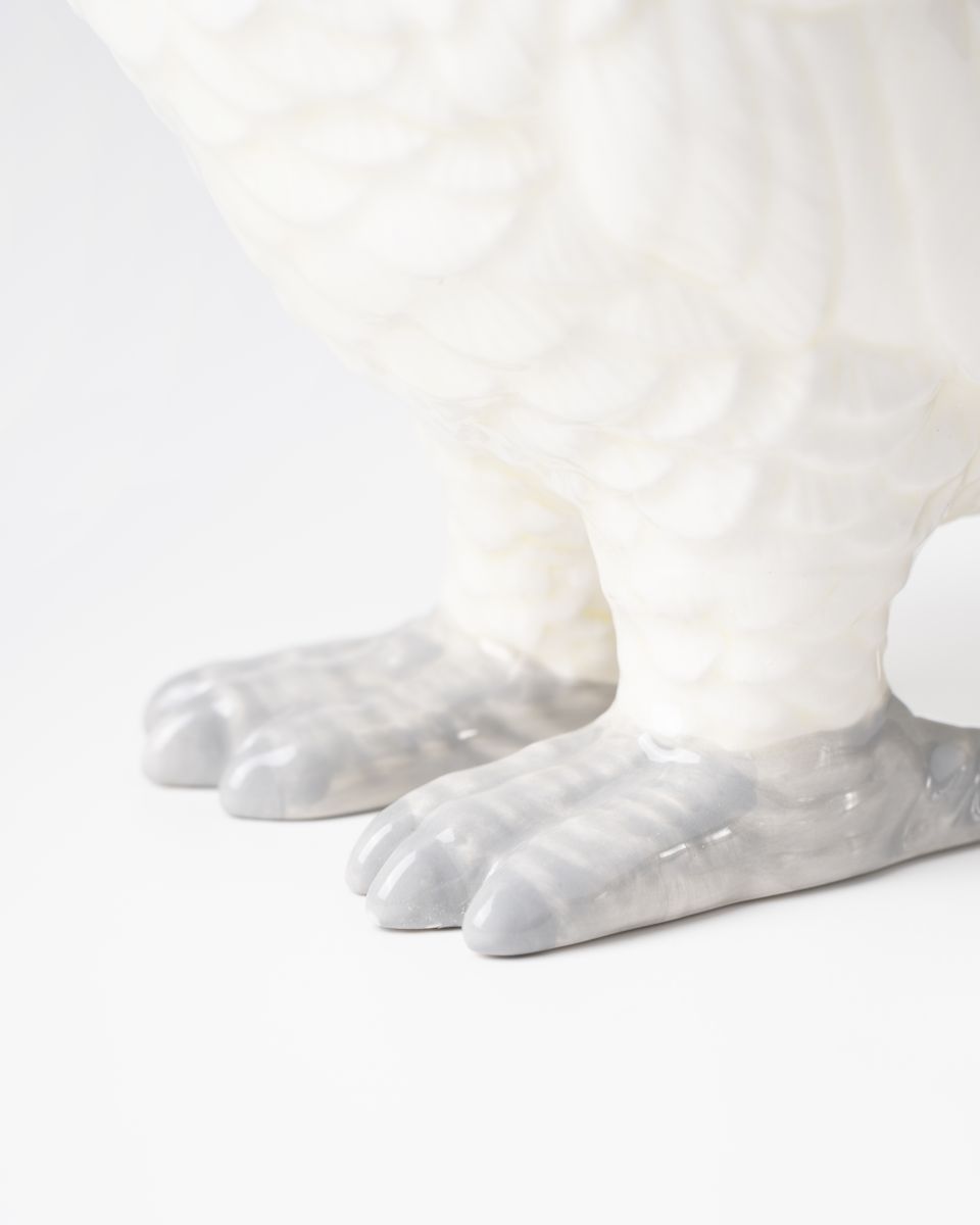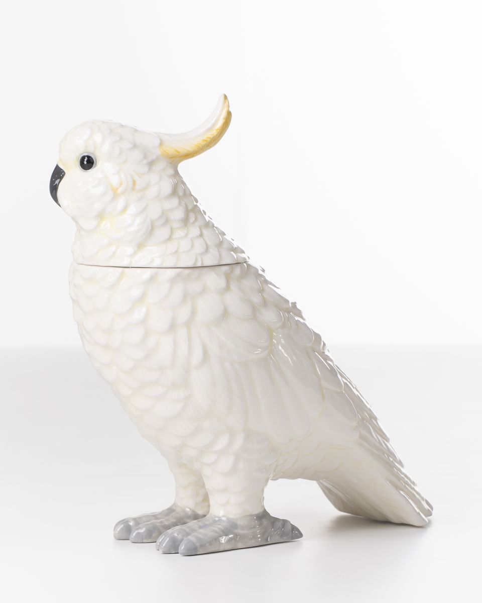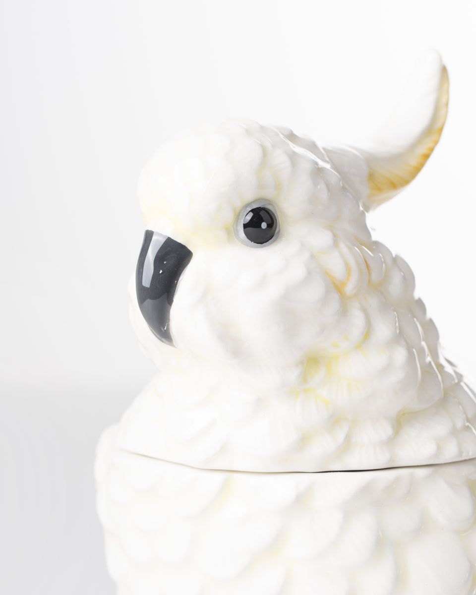 The Ceramic Cockatoo Jar is a delightful fusion of charm and craftsmanship. Expertly sculpted to capture the graceful form of a cockatoo, this decorative jar features intricate feather detailing and a soft white glaze with subtle yellow and grey accents. Its removable head reveals a functional storage space, making it as practical as it is eye-catching. Perfect for adding personality to a shelf, console, or kitchen counter, this piece brings a touch of tropical elegance to your home décor.