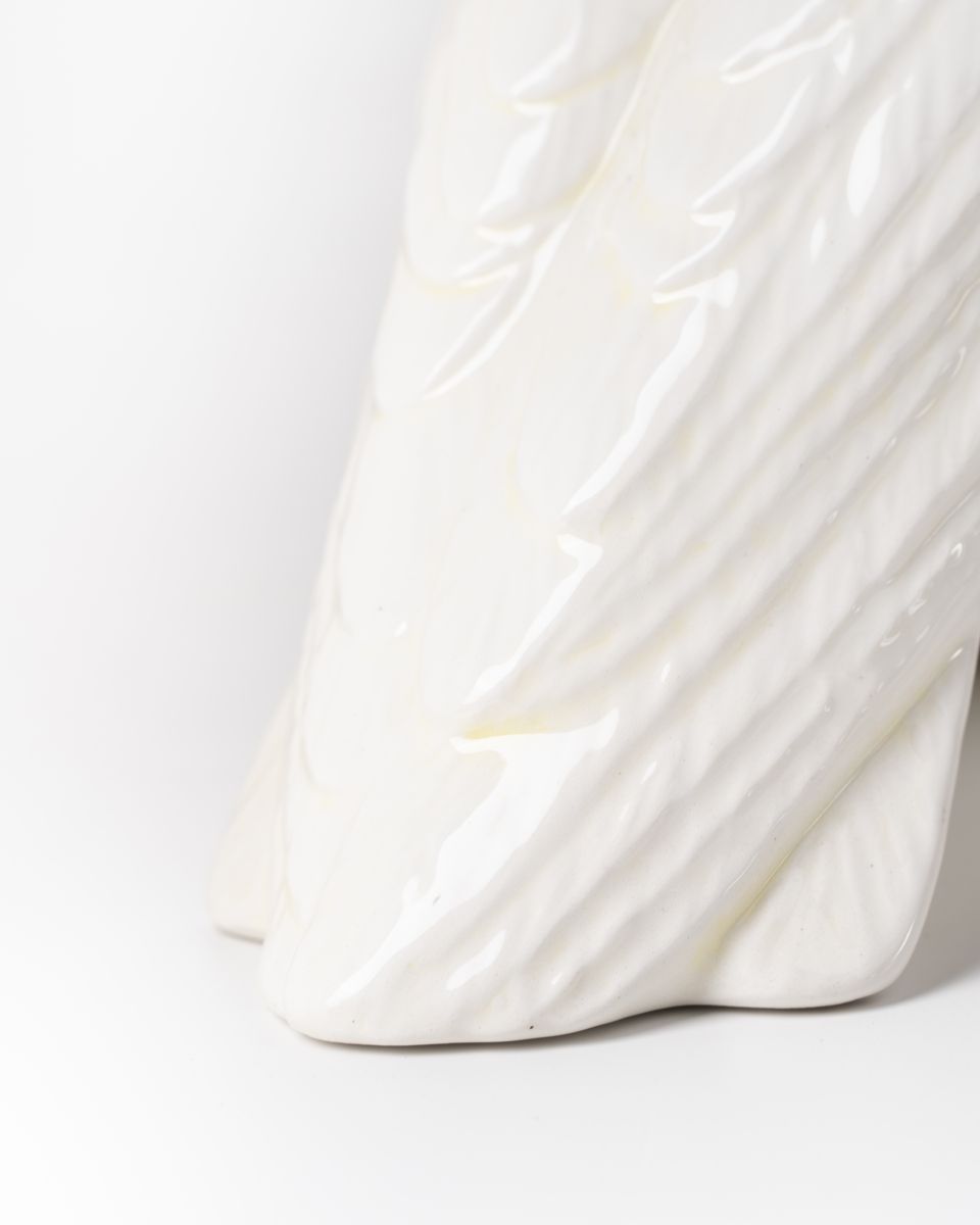 • Finished in a glossy white glaze with soft yellow and grey highlights