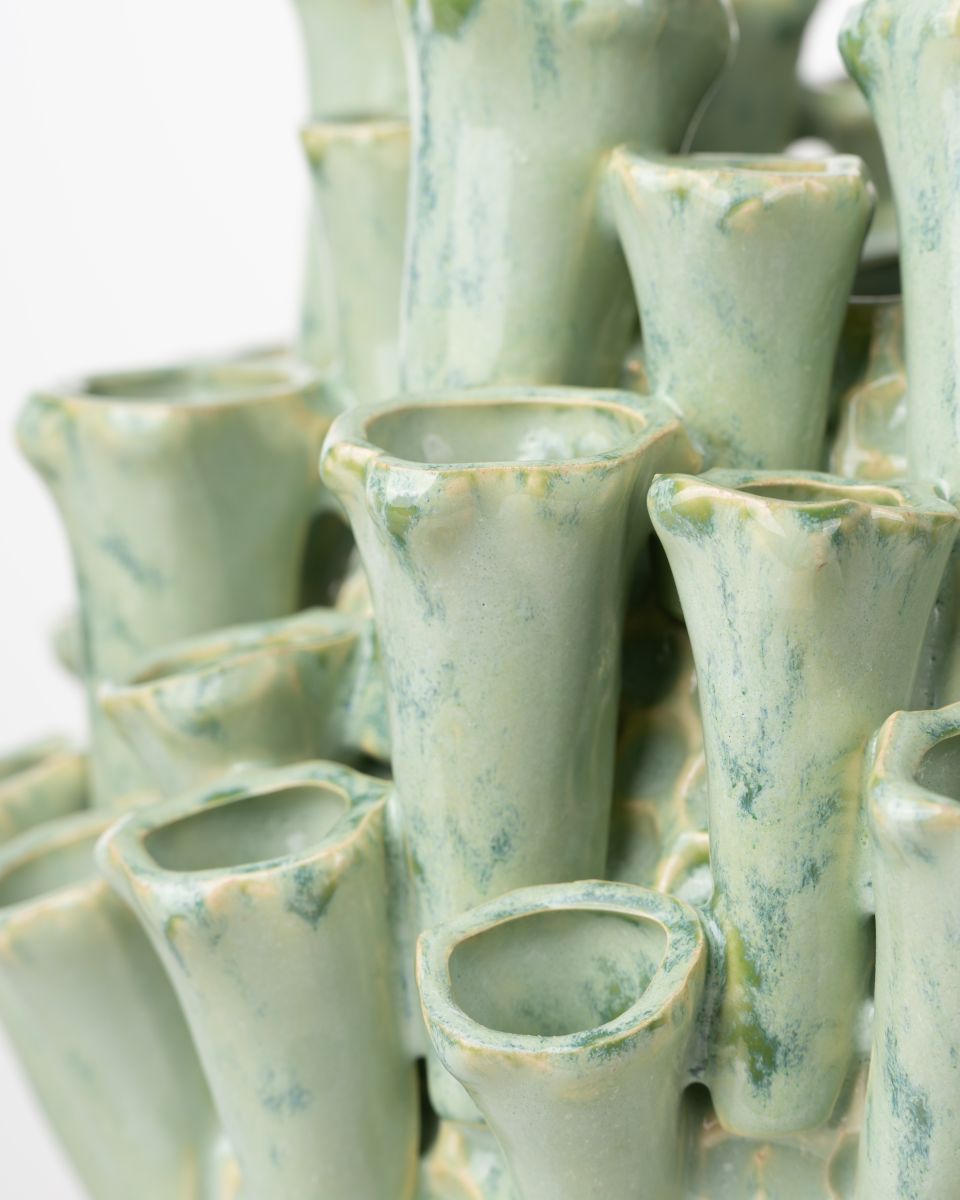 The Cordelia Ceramic Vase is a captivating piece that adds a fun, arty texture to any space. This ceramic vase features a unique design in a beautiful green glaze. It works best without flowers — let its unique design shine on its own or as part of a collection of ceramics.