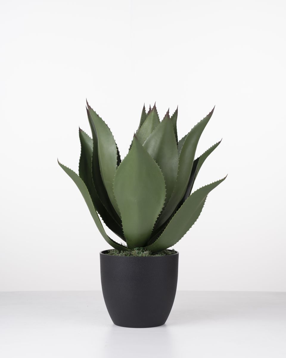 A sophisticated accent piece, the Faux Agave Plant features thick, pointed leaves crafted from durable materials. Its deep green tones and sleek black pot make it a stylish decorative option for modern or minimalist interiors.