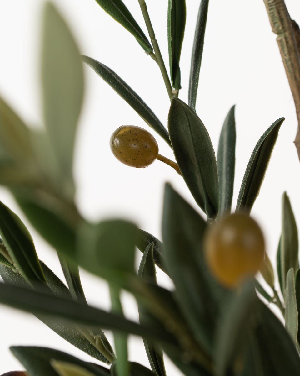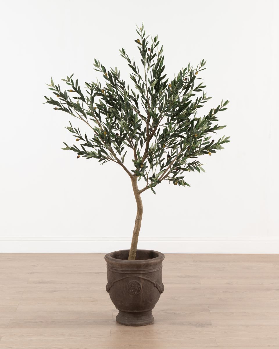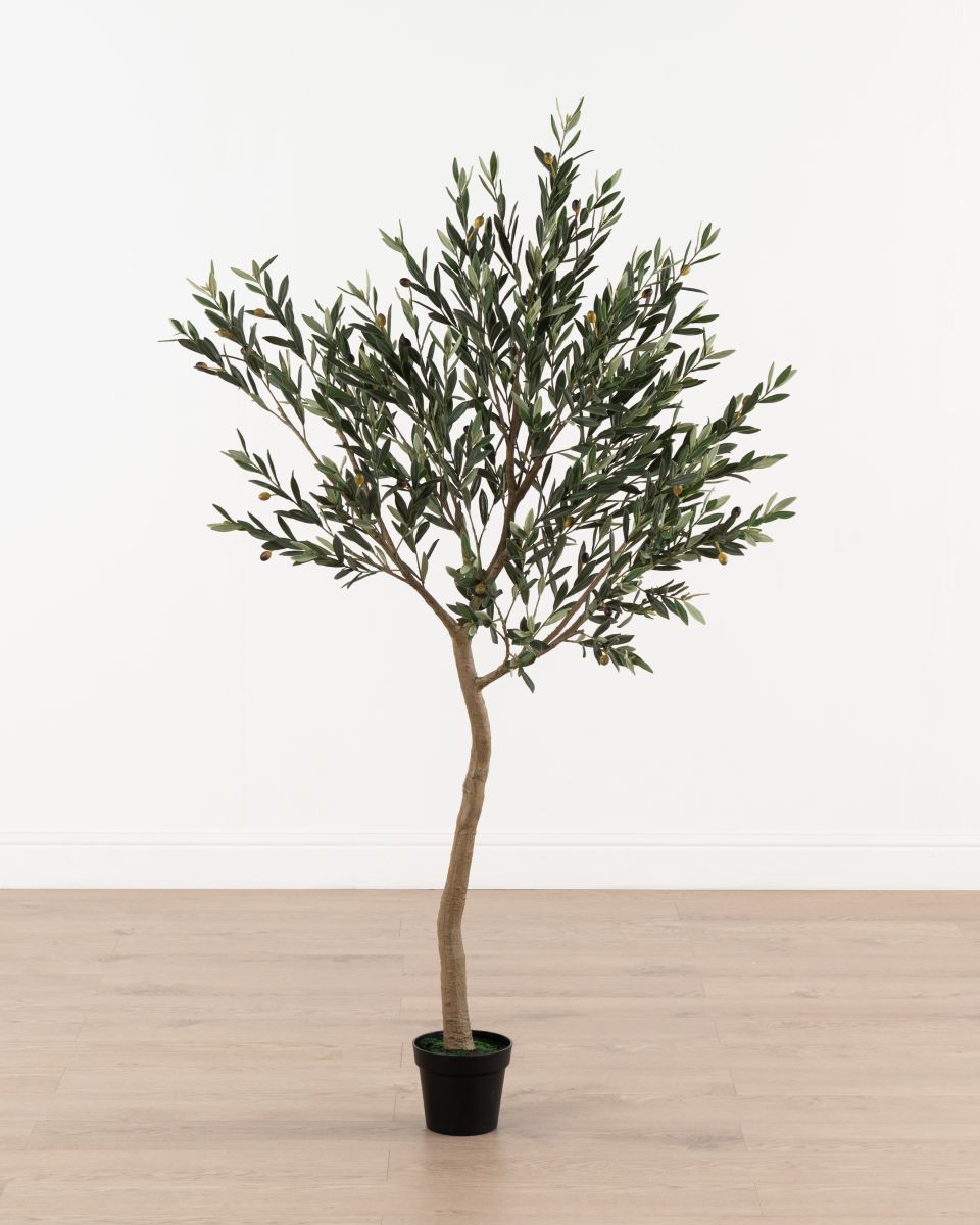 Carefully crafted for a lifelike look, the Faux Olive Tree features a slender, textured trunk that supports a graceful spread of delicate green leaves. Tiny olive accents are scattered throughout the foliage, adding authenticity and a touch of rustic elegance. Its airy branches and natural silhouette bring height and texture, making it ideal for filling corners, framing entryways, or brightening up living spaces. Effortlessly stylish and low maintenance, it offers warmth and sophistication.