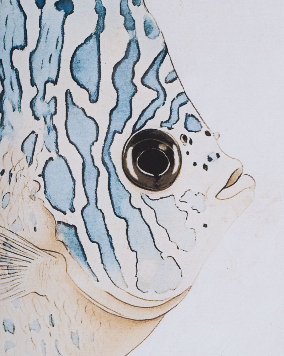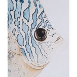 - Features a finely detailed illustration of a fish in shades of soft blue, cream, and grey