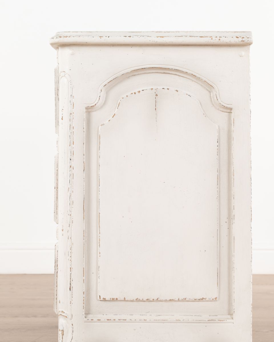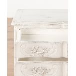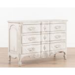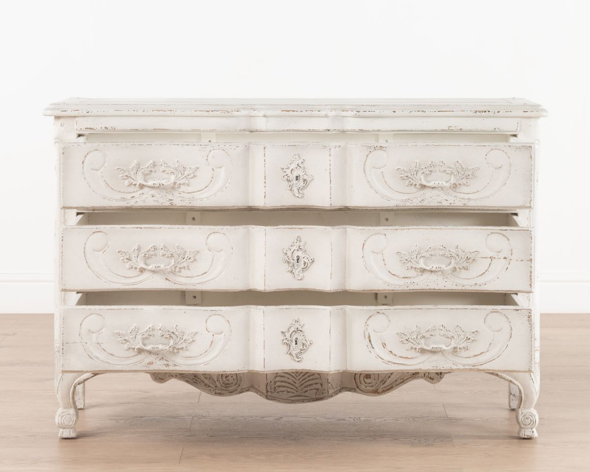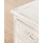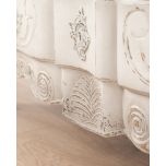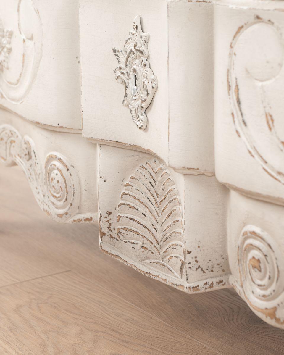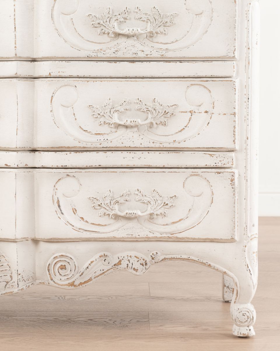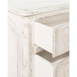 The Guirlande chest of drawers from the Chateau collection is a generous and highly decorative storage solution, perfect for larger bedrooms. Crafted from mindi wood with a sleek white finish, this versatile piece can serve as a higher bedside table or a chest of drawers for a TV, seamlessly fitting against any wall to offer ample storage. Style it with complementary decor or use it as an elegant standalone piece.