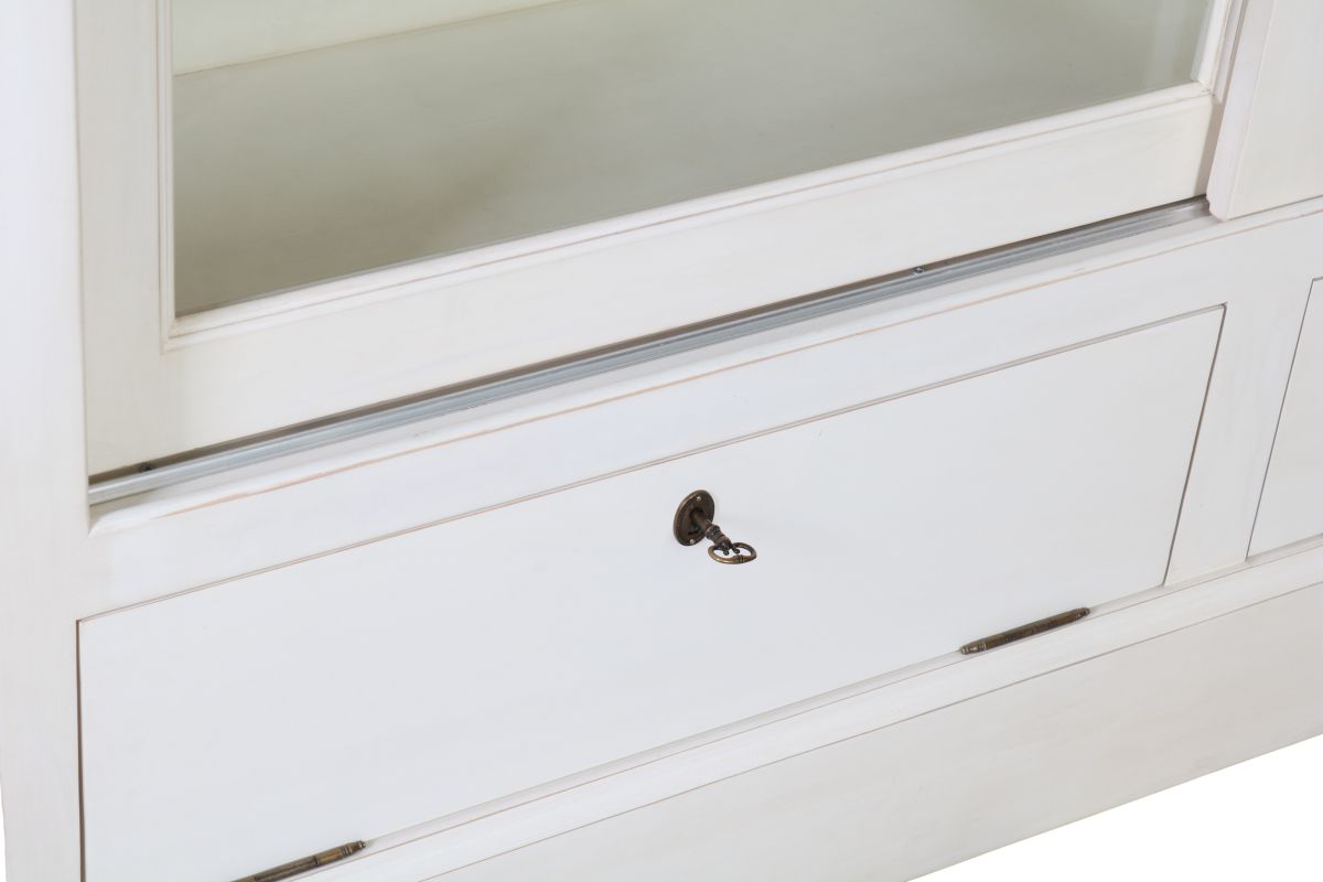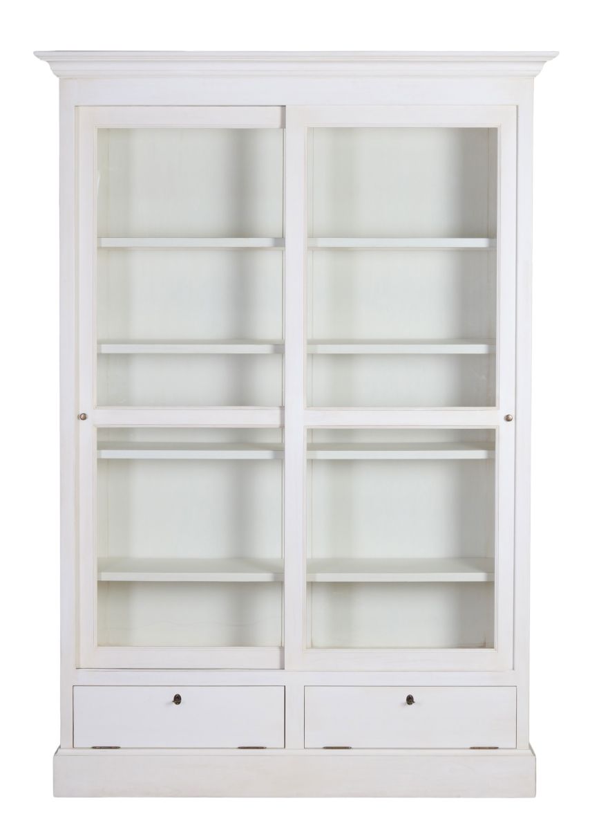 HAMPSHIRE Bookcase with Glass fronted sliding door provides the perfect showcase for all your favourite books, decorative items, and more. The English Country Style design of this bookcase is all about simplicity coupled with exceptional craftsmanship. The attention to detail is evident in the Oxford borders, panelling, and meticulously crafted handles. One distinctive trademark of the English Country Style is the use of slatted wood, which adds a charming touch to any room. Whether you incorporate it on your walls, as your flooring, or through a key furniture piece like our glass-fronted sliding bookcase with slatted shelves, this style is sure to impress.