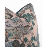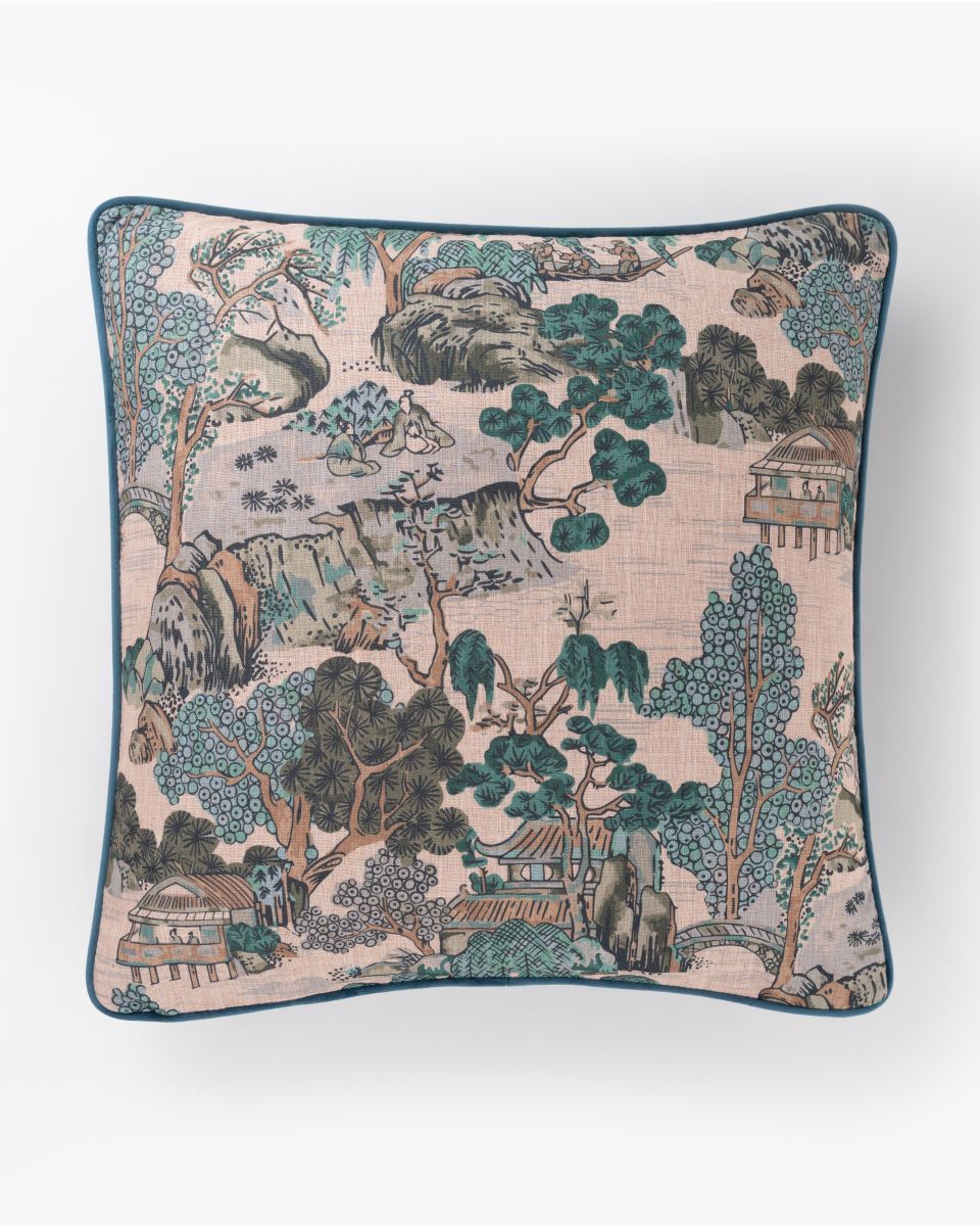 The front panel is made from natural linen, featuring an intricate Japanese-inspired countryside print—lush trees, scenic landscapes and traditional architectural motifs in calming shades of teal, green and soft neutrals.