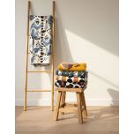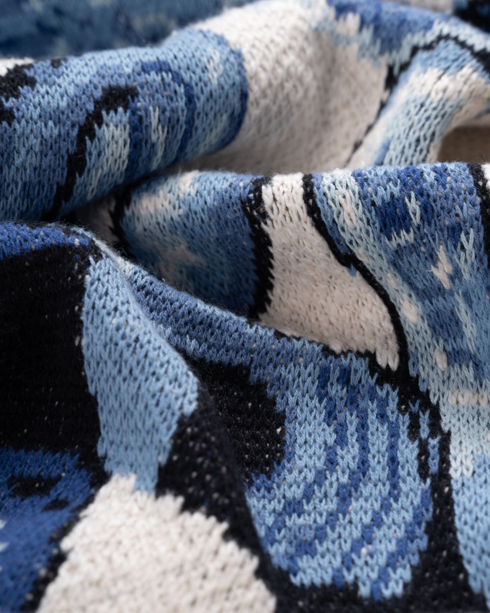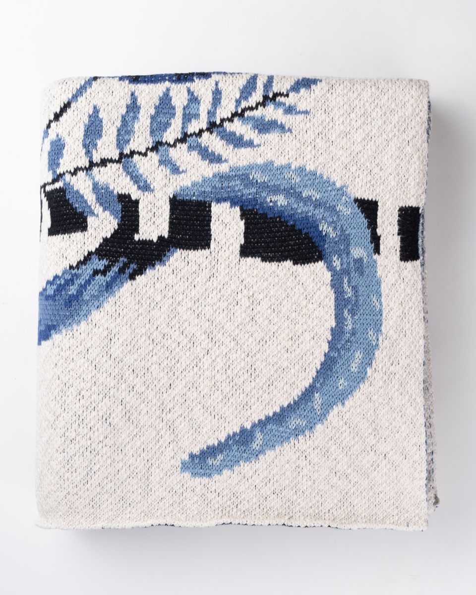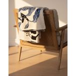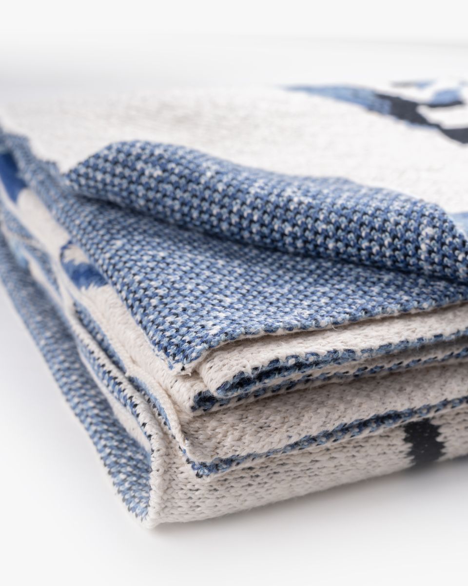 The reverse side showcases a finely textured mottled weave in shades of blue and white, offering a more understated option while maintaining the same cosy comfort. Lightweight yet warm, the Jungle Blues Throw drapes effortlessly over sofas, beds, or reading nooks, infusing your space with personality, texture, and a sense of adventure.