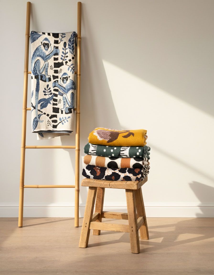 Add a touch of playful wilderness to your home with the Jungle Blues Throw. Crafted from soft, breathable 100% cotton, this beautifully knitted throw features an enchanting blue-toned jungle scene where expressive monkeys climb and swing among stylised leaves and graphic tree trunks. The calming palette of indigo, sky blue, navy, and cream makes it both eye-catching and soothing—perfect for modern, eclectic, or nature-inspired interiors.