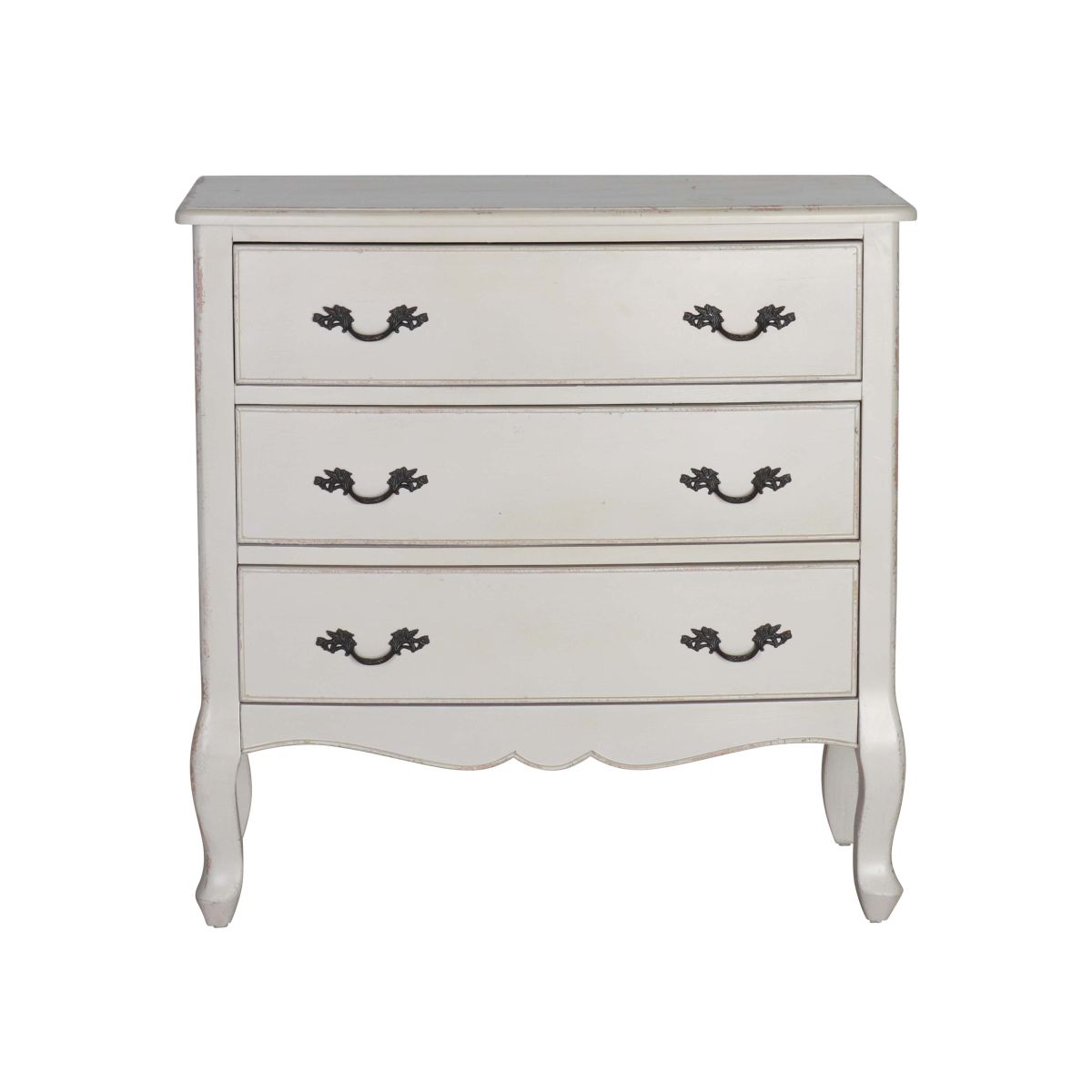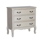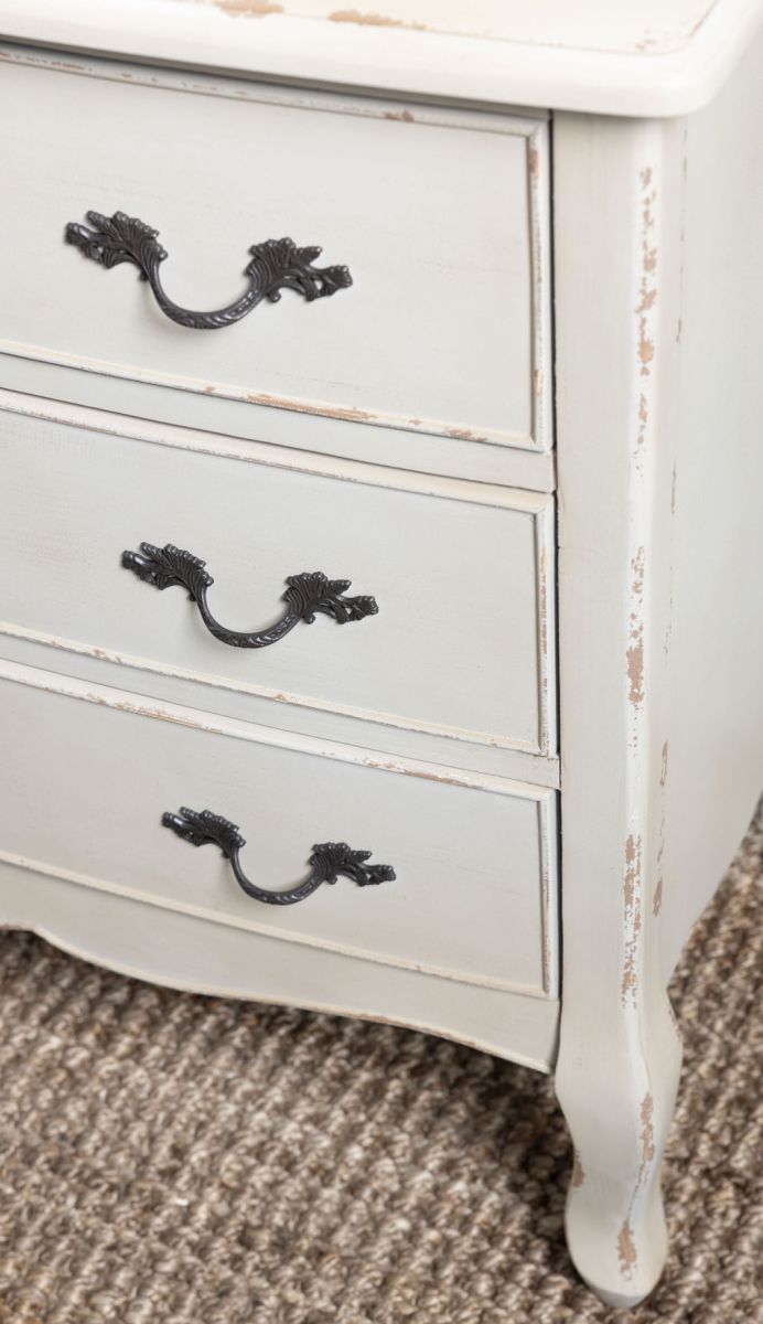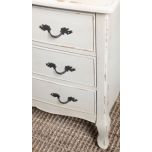 The Château Louise chest of drawers features a French inspired design. The chest of drawers is coloured in Antique White with slight distressing which gives a refreshing and spacious feel to any room. The bow front, tapered legs and ornate drawer pulls adds grace and antique charm to this beautiful piece.