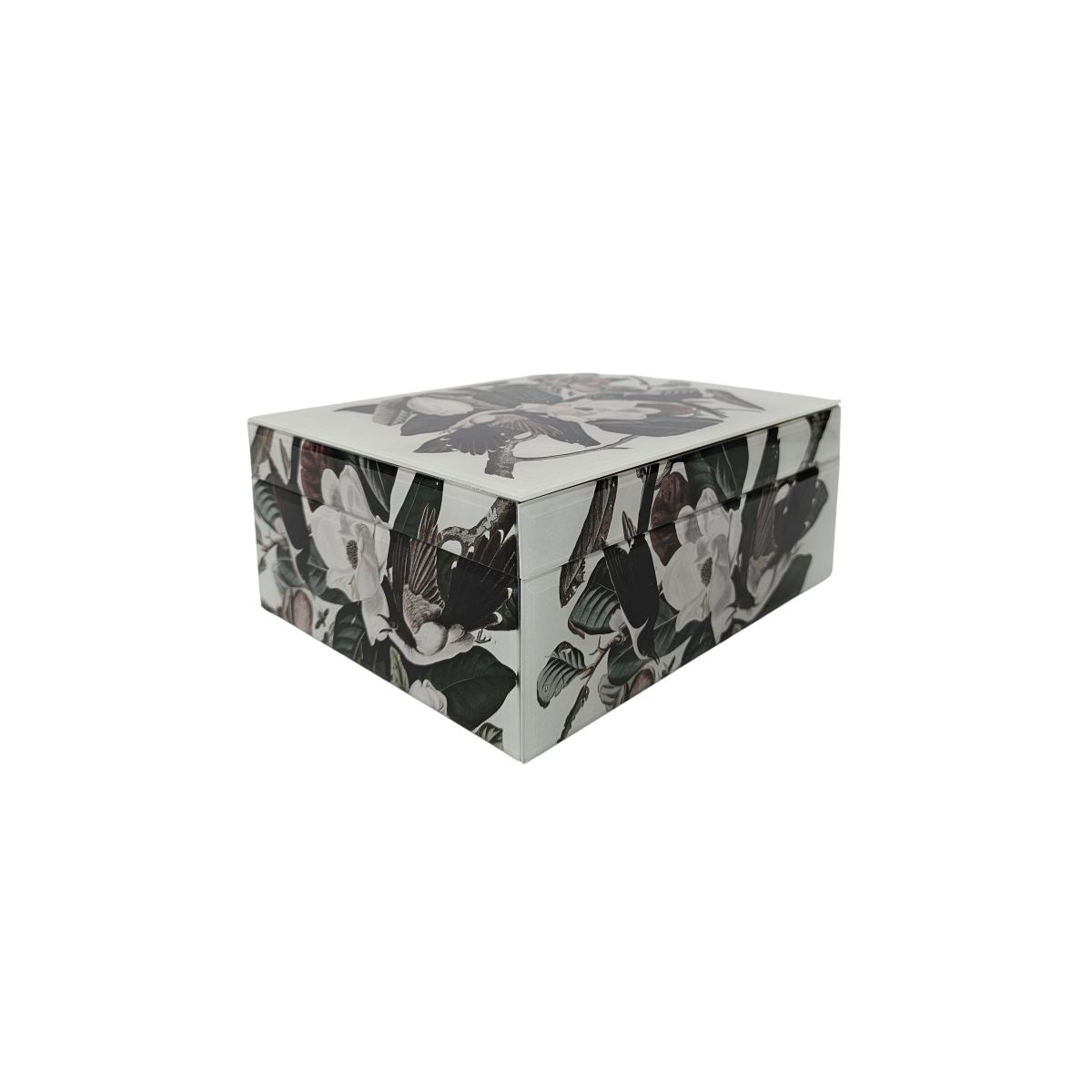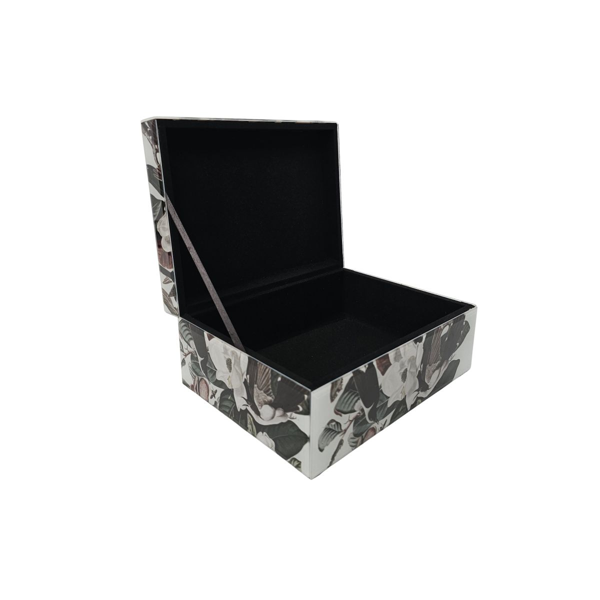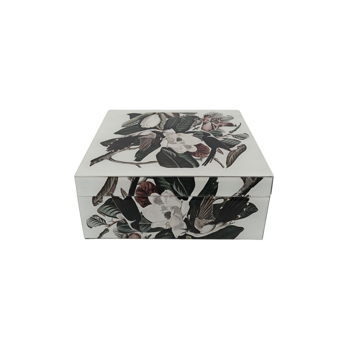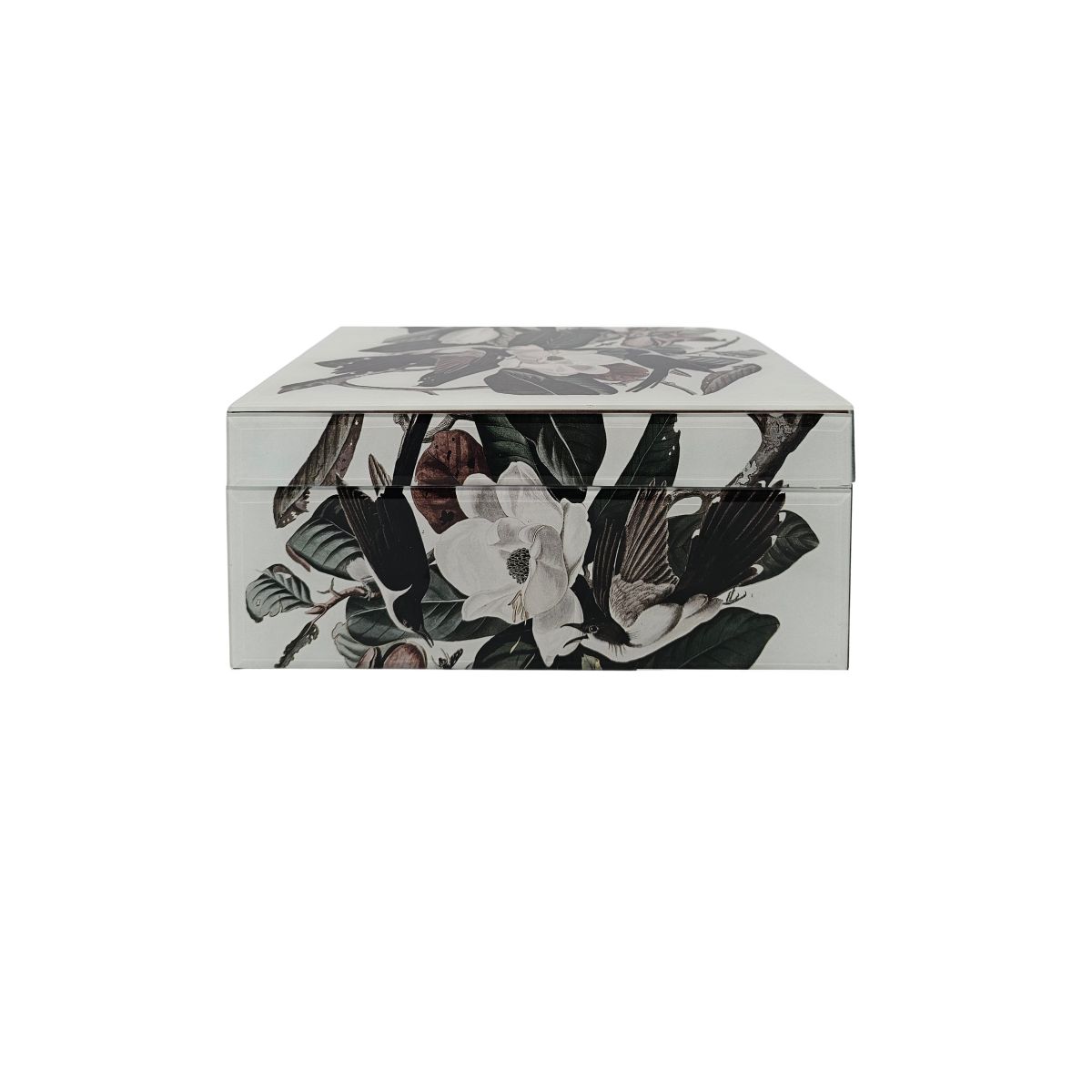 The Magnolia Storage Box is the perfect combination of beauty and function. The hinged lid opens to a spacious interior, ideal for storing a variety of items. Featuring a floral design, it adds a touch of elegance to any space. This versatile glass box is perfect for keeping your space tidy while adding a touch of natural beauty.
