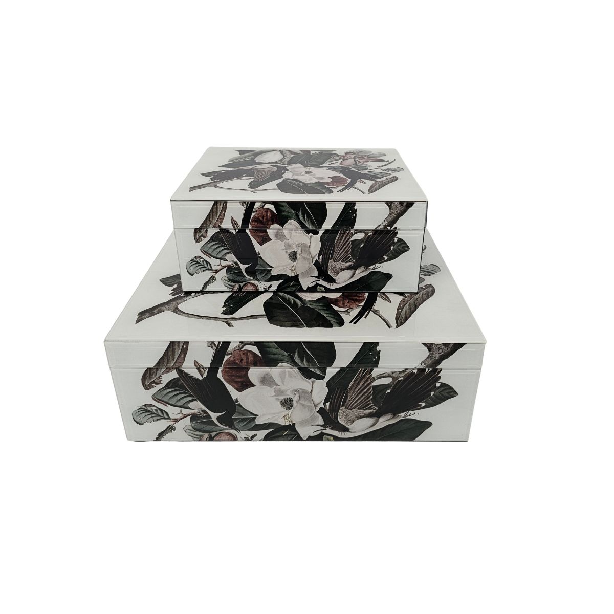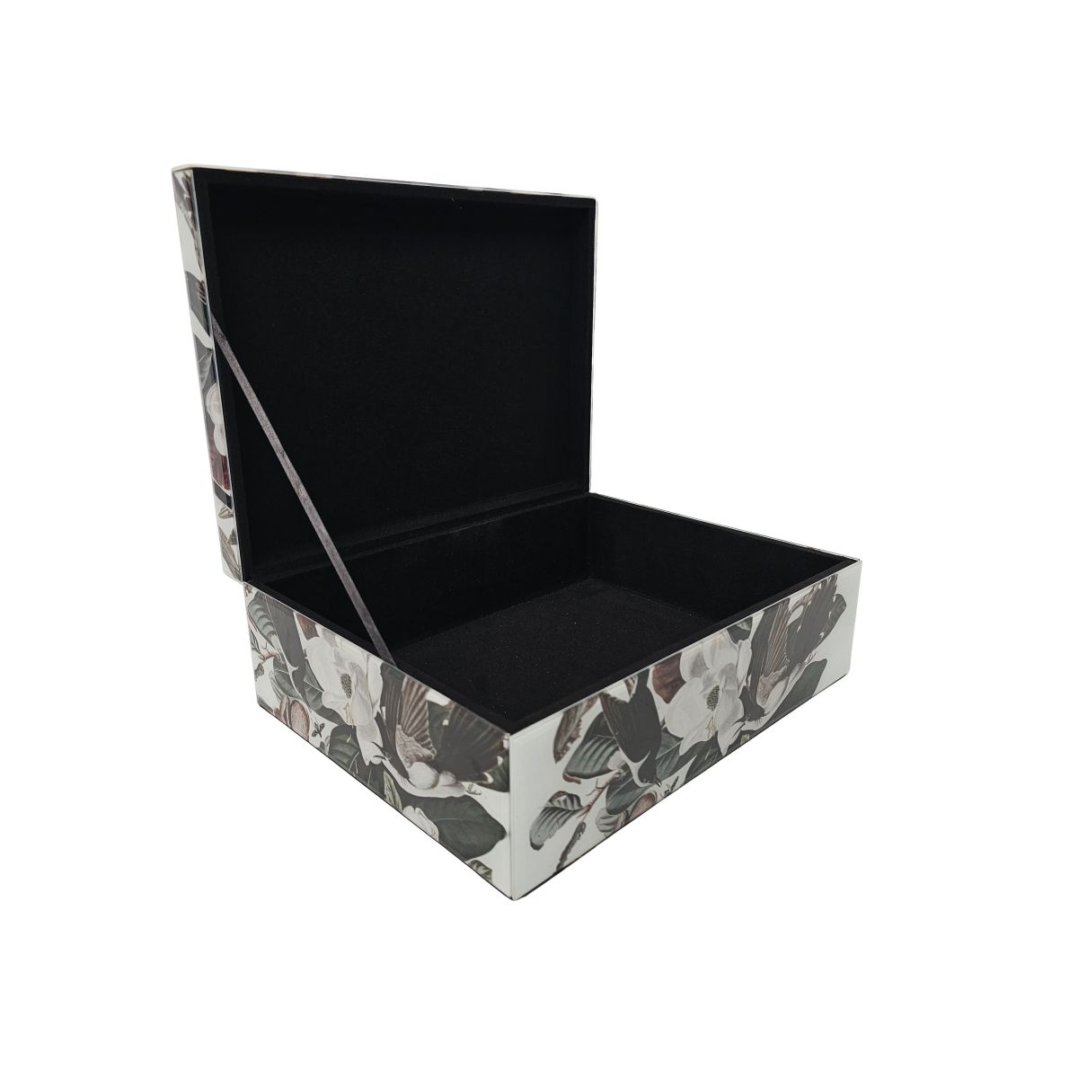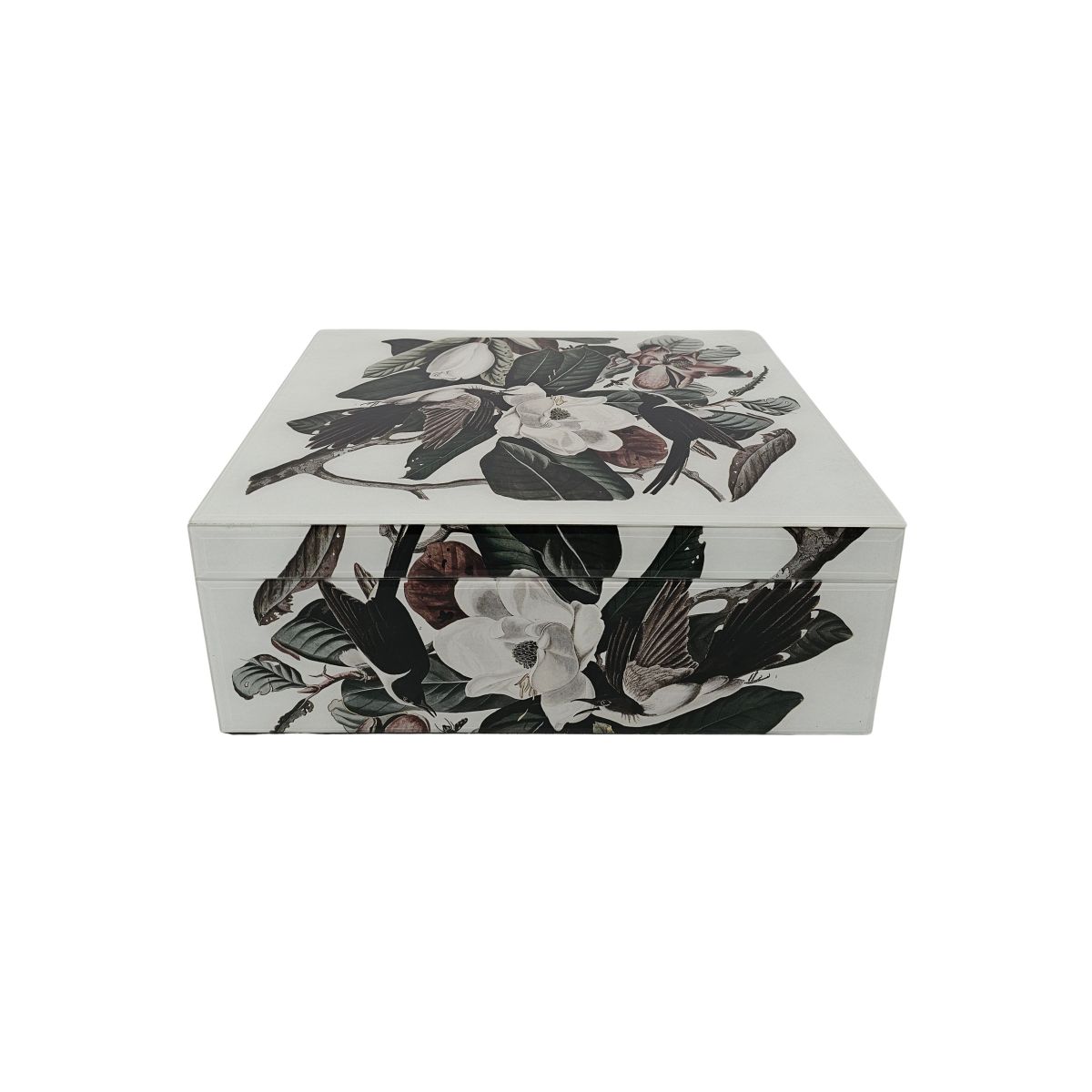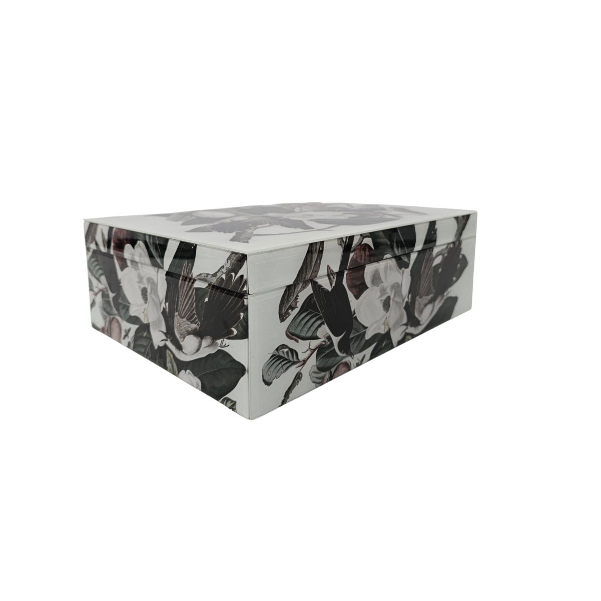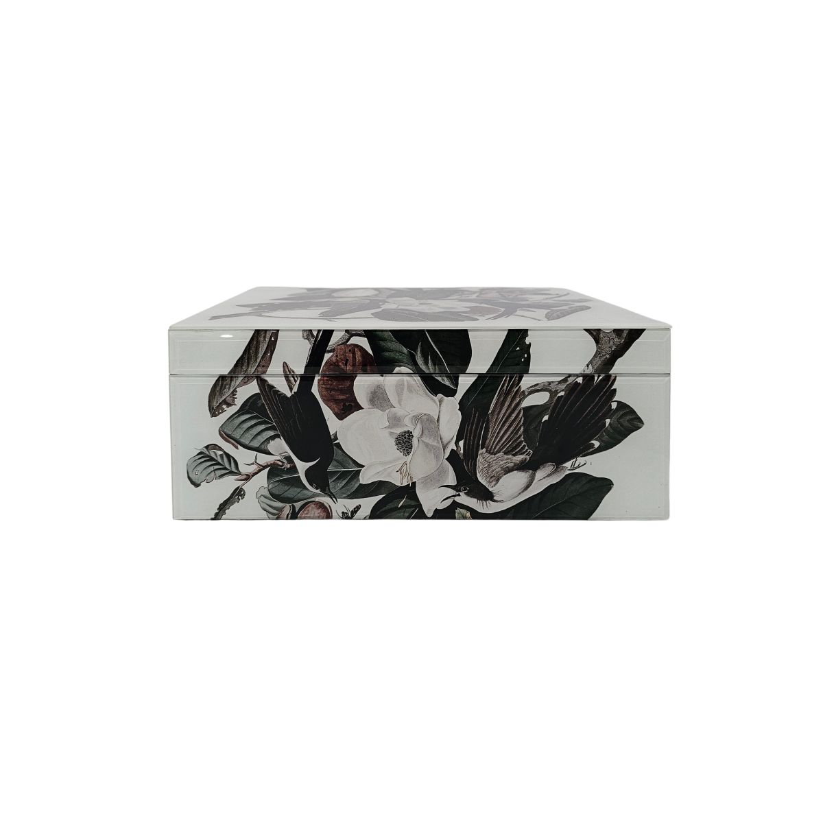 The Magnolia Storage Box is the perfect combination of beauty and function. The hinged lid opens to a spacious interior, ideal for storing a variety of items. Featuring a floral design, it adds a touch of elegance to any space. This versatile glass box is perfect for keeping your space tidy while adding a touch of natural beauty.