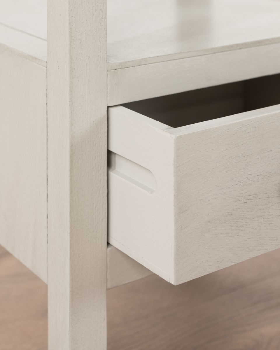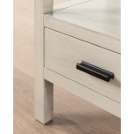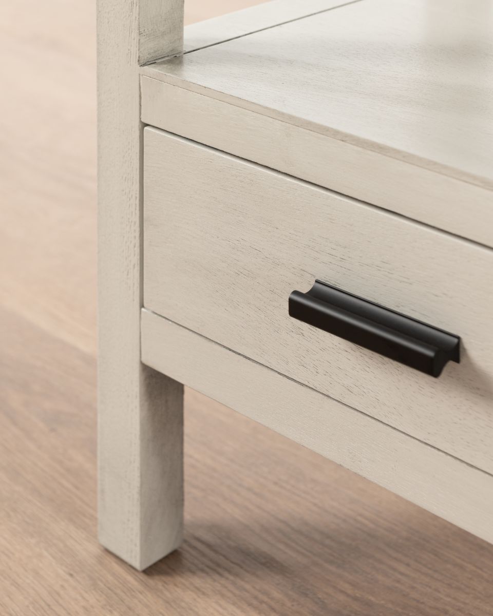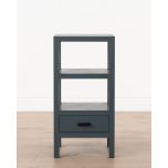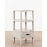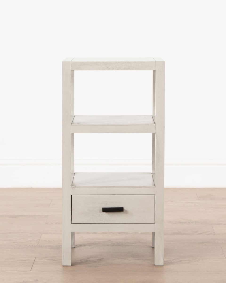 - Features two spacious shelves ideal for décor or bedside essentials and a single lower drawer fitted with a sleek, rectangular metal handle