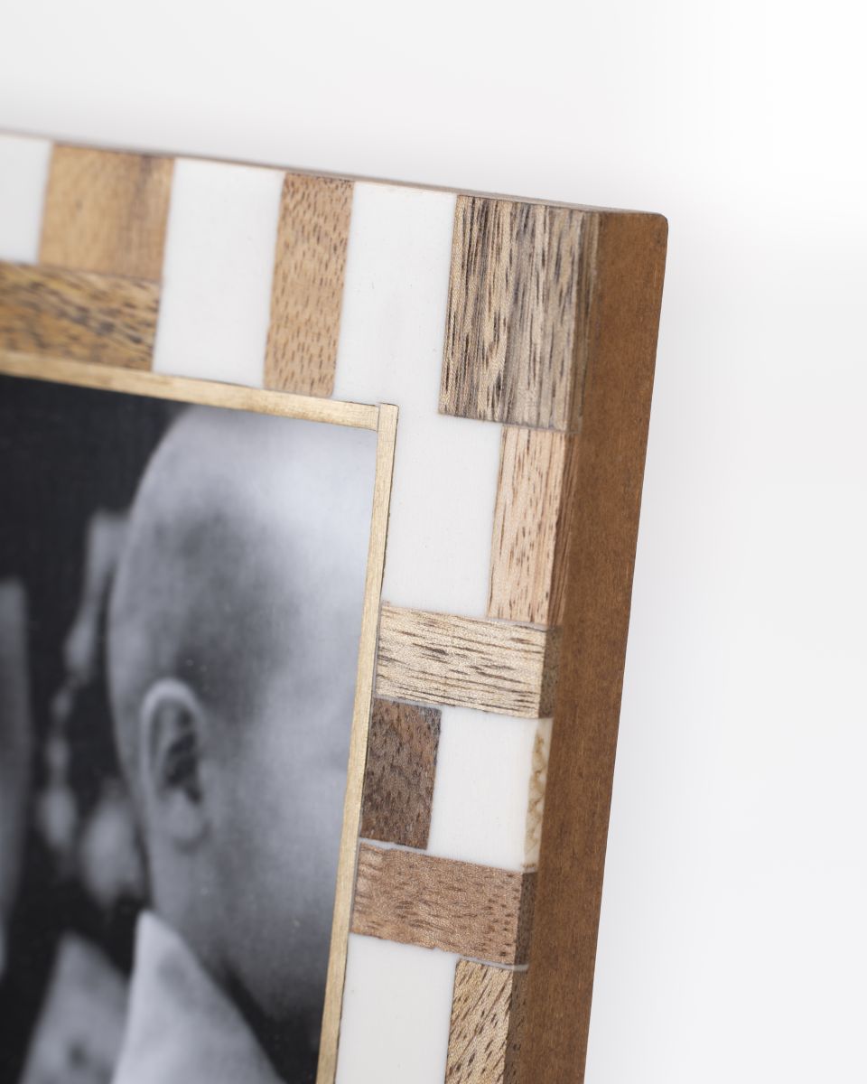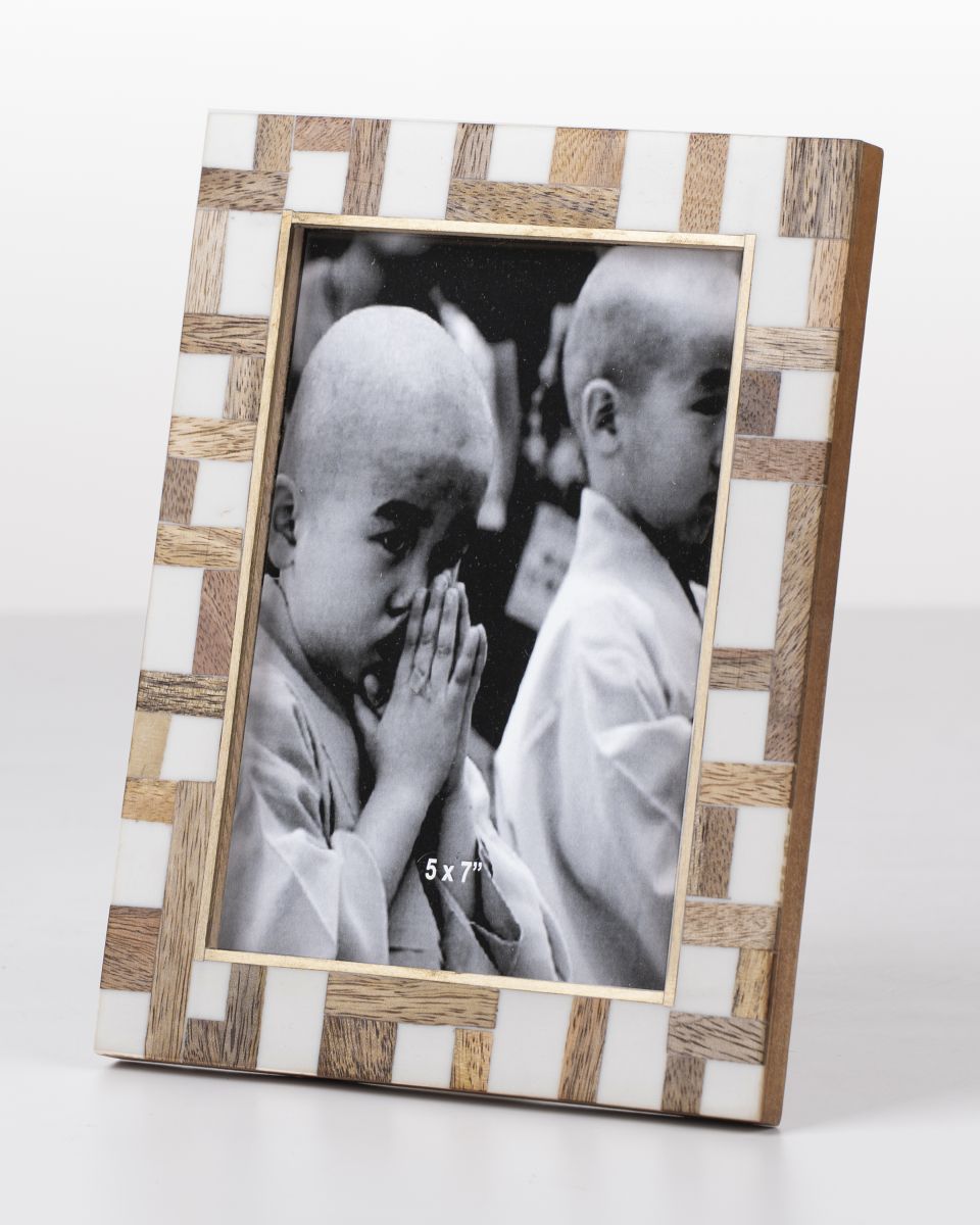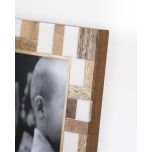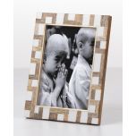 he Natural Wood & White Inlay Photo Frame offers a refined, modern take on traditional craftsmanship. Designed with alternating bone and wood strips, it creates a clean, linear pattern that beautifully complements both contemporary and rustic spaces. This elegant frame enhances any photograph while adding a touch of natural charm to your décor.