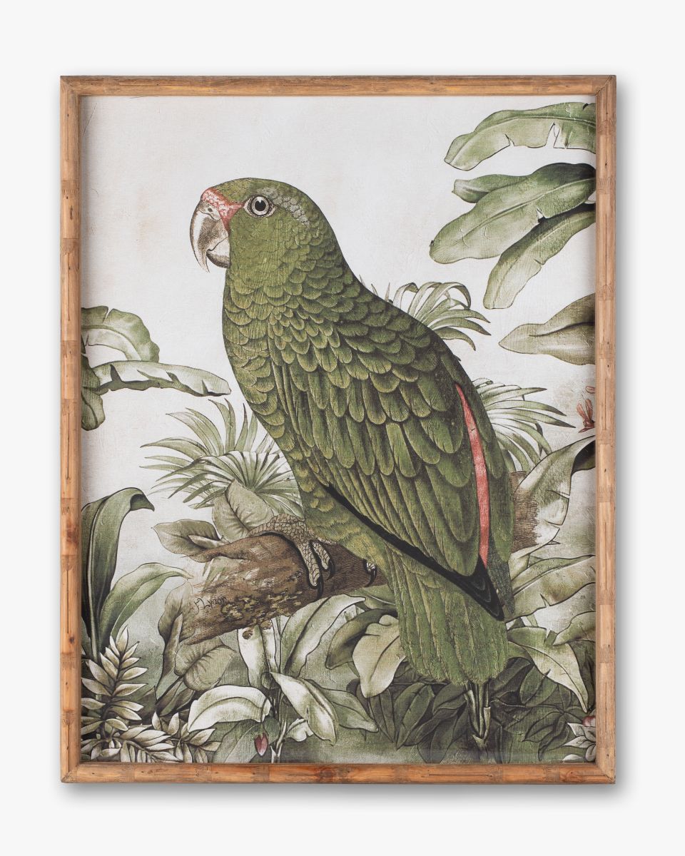 Bring a tropical touch to your space with the Banana Tree Framed Wall Art. Featuring a beautifully detailed illustration of a parrot perched amidst lush tropical foliage. The neutral background and vintage-style wood and rattan frame give the piece an archival quality. Complete with a wooden frame in a textured finish, it's a bold yet elegant piece that works wonderfully as a standalone piece or as part of a curated gallery wall. Ideal for living areas, hallways, bedrooms or studies.