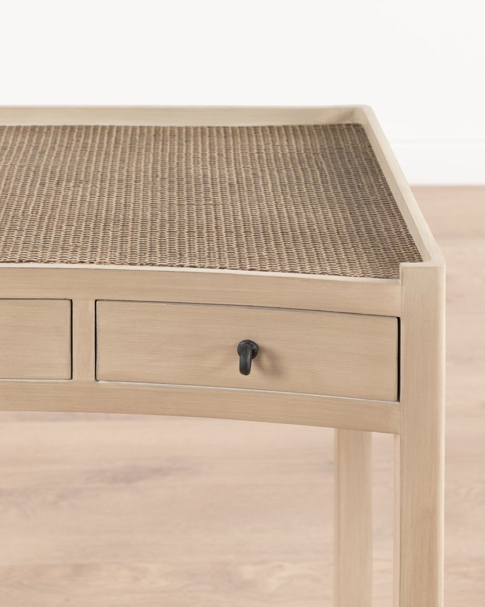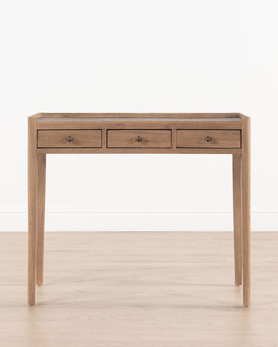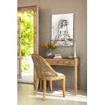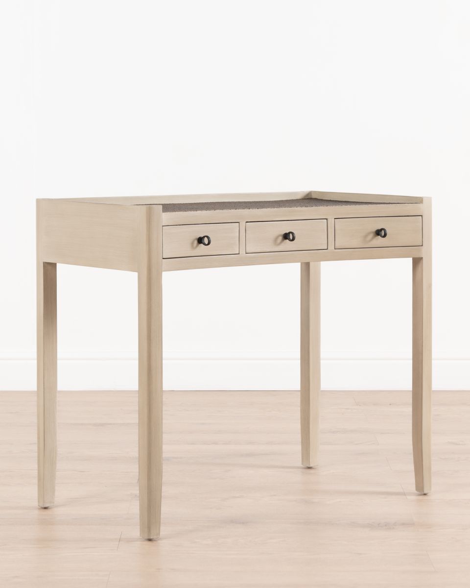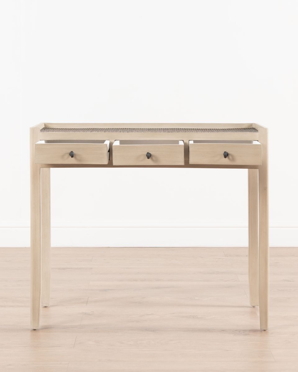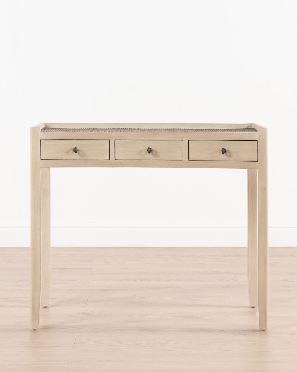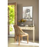 The Plantation writing table from the Villa collection is a versatile piece that blends French classic design with practical elegance. Perfect as a mini dressing table or a quiet bedside companion, it offers just enough space for all your essentials. Whether used as a desk in smaller bedrooms or as an accent piece in guest rooms, this table brings a touch of sophistication to any space. It's painted finish adds a creamy whiteness, ideal for brightening up areas that crave light. Consider placing it in an entrance hall, where its understated charm will greet guests with subtle grace. Style with a sleek mirror or delicate vase to enhance its timeless appeal.