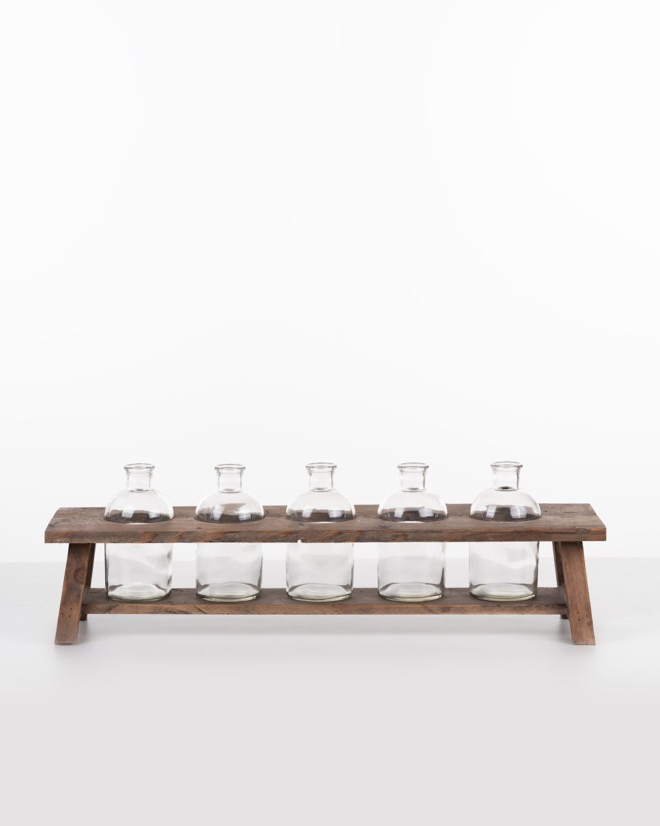The Ridgefield Vase Rack captures the beauty of simplicity through its rustic yet refined design. Expertly crafted from solid reclaimed-style firwood, this piece features five clear glass vases nestled within a sturdy wooden frame. The natural wood tones and smooth glass create a perfect balance of texture and transparency, adding organic warmth to any setting.