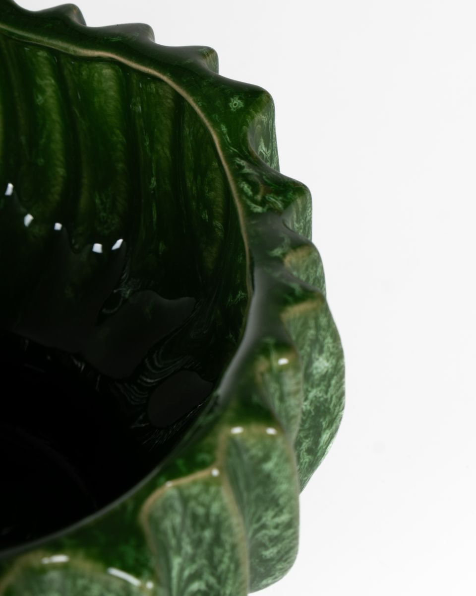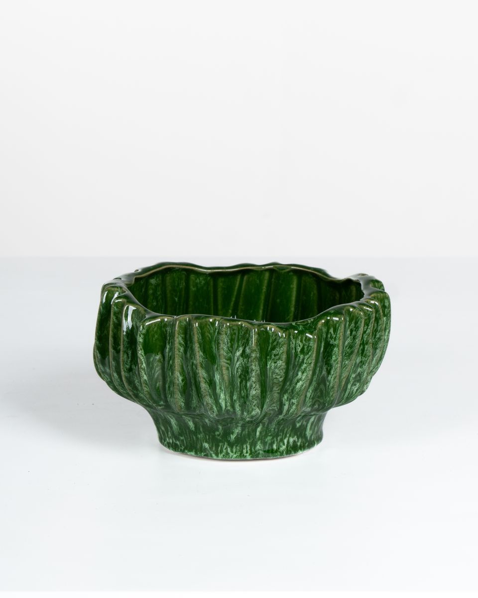 The Saturn Ceramic Bowl features a rounded, fluted form. Its soft, organic form is finished in a deep, glossy green glaze for a bold, strong statement piece. Versatile — it complements a variety of interior styles and works well in different rooms.