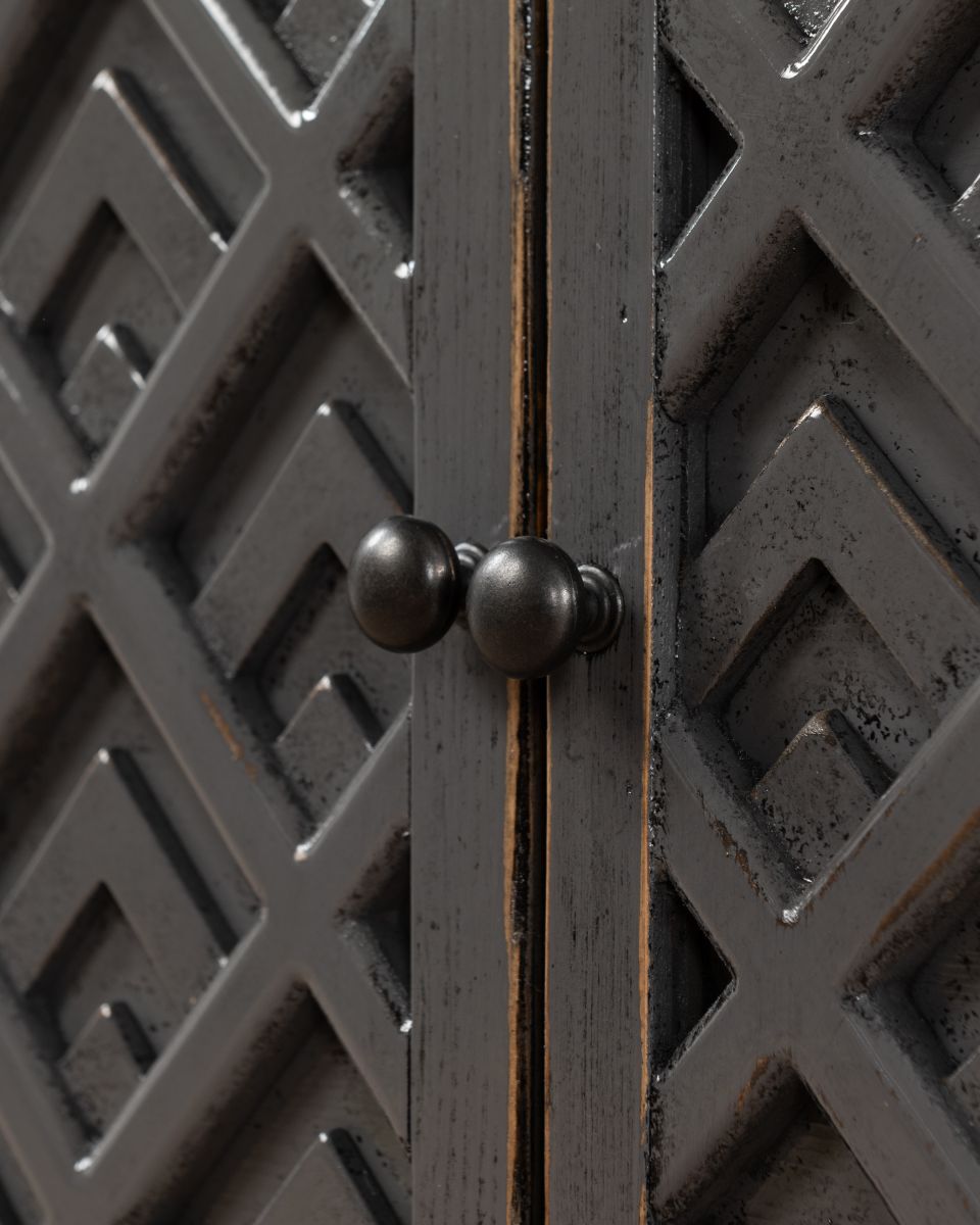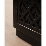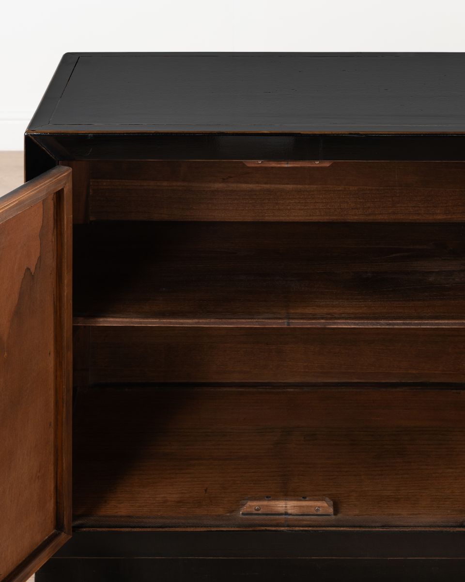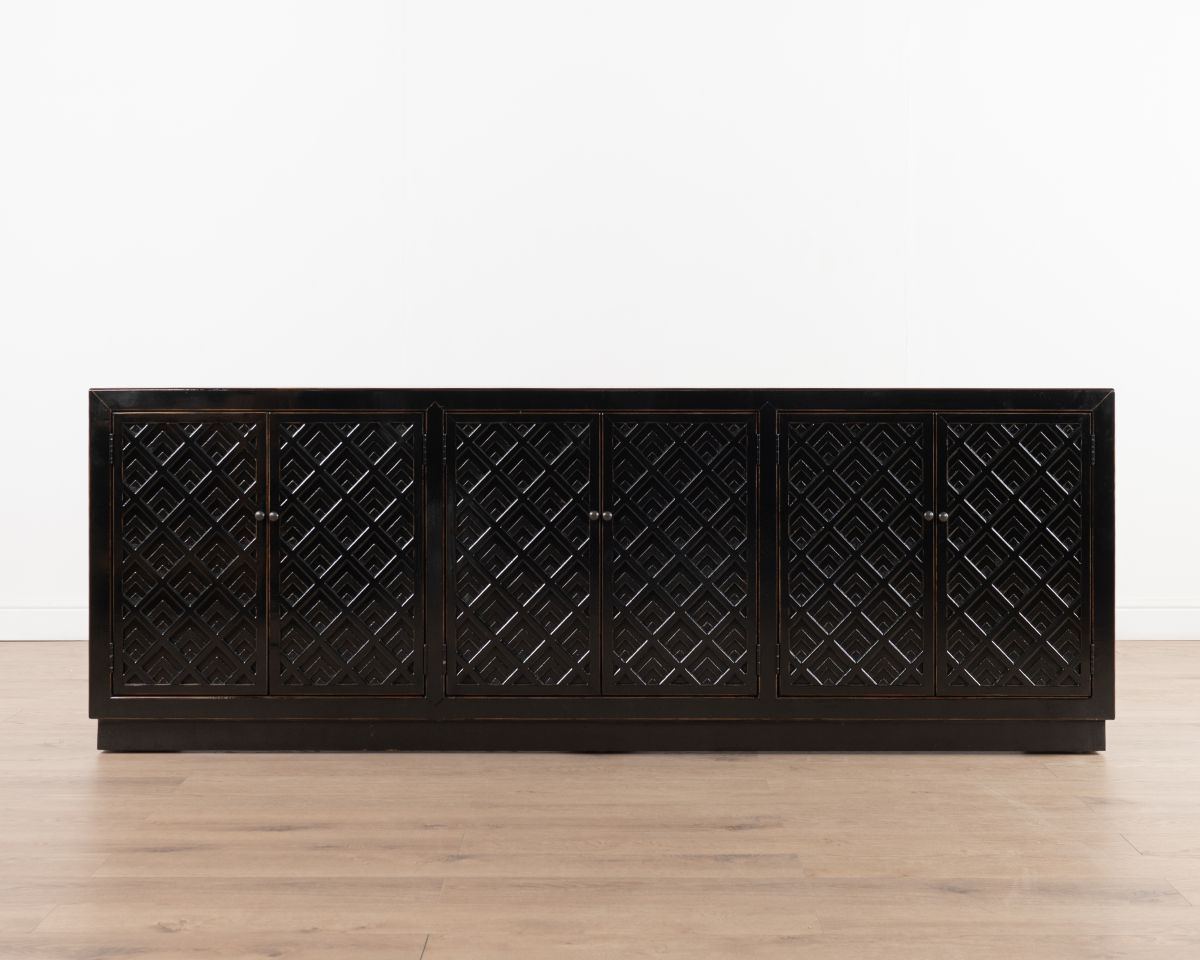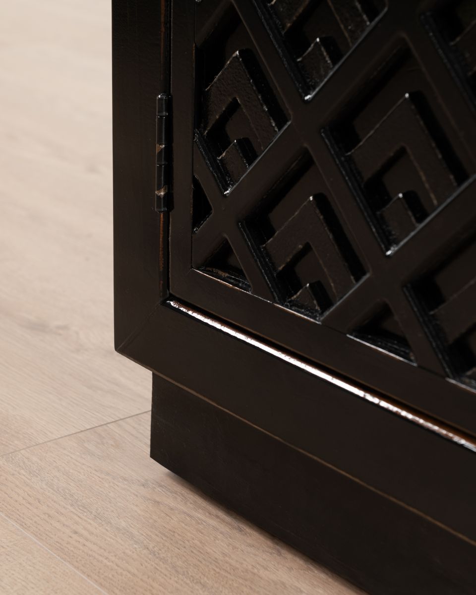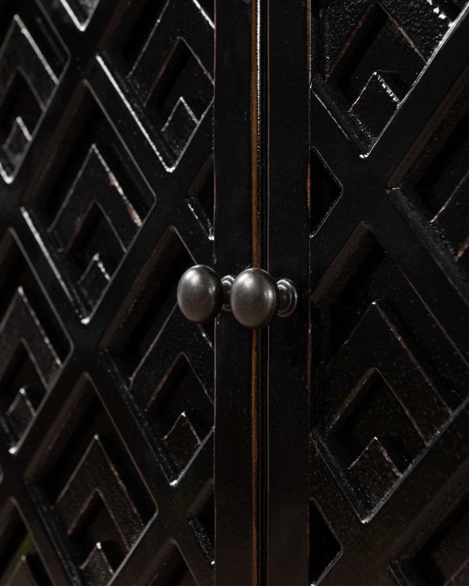 The Shango Sideboard from our Ebony Collection blends vintage and contemporary design with its ornate, carved detailing and overall sleek design. It's crafted from durable pine wood with dainty, metal handles. Its ample storage space makes it a practical addition to a lounge or dining room while its striking design makes it a perfect statement piece as well.
