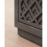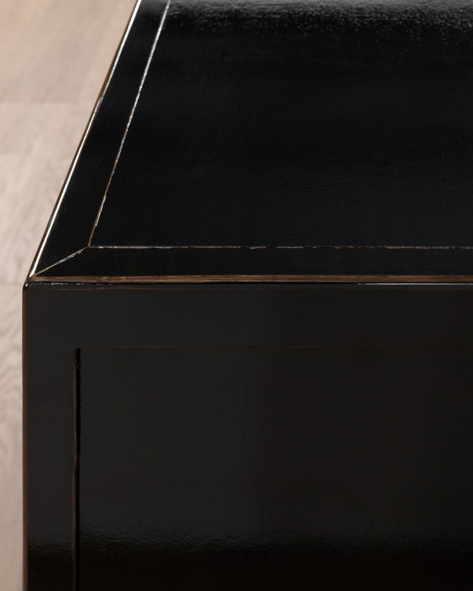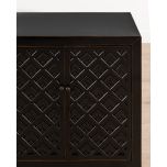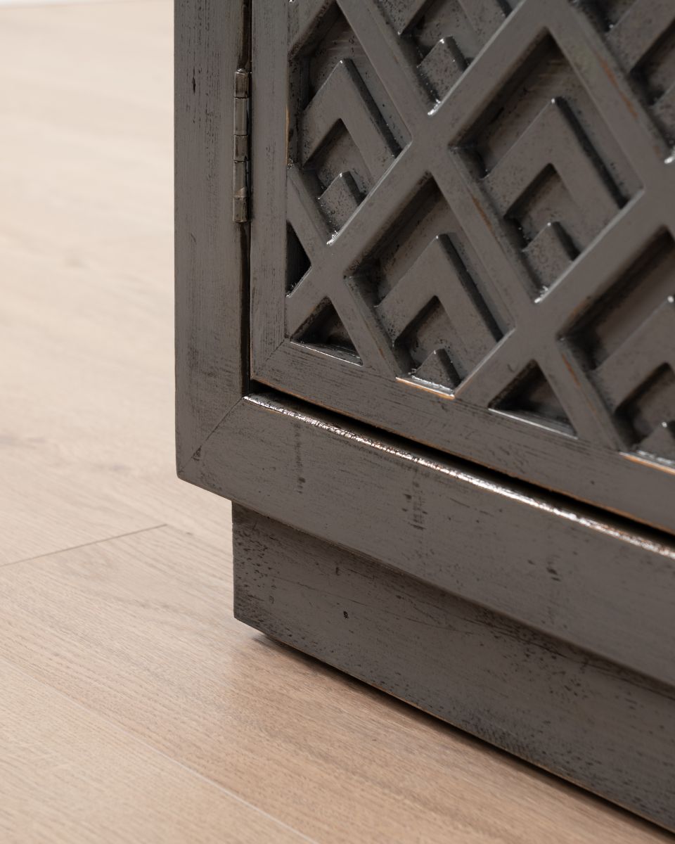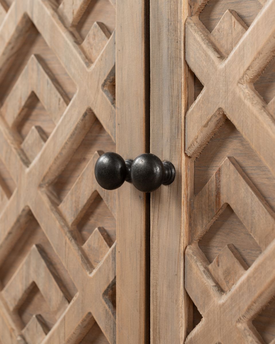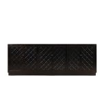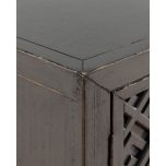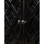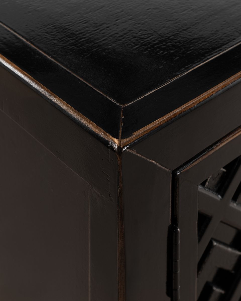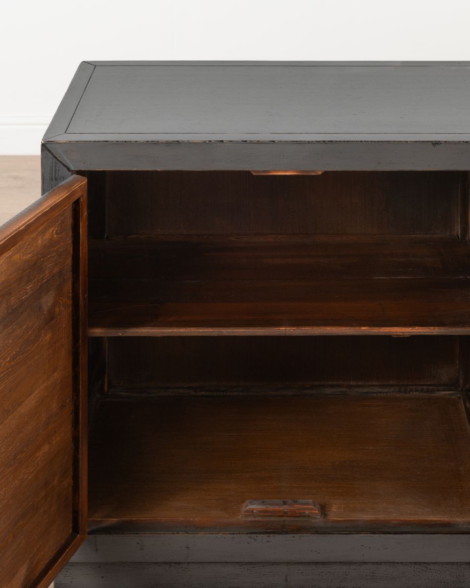 The Shango Sideboard from our Ebony Collection blends vintage and contemporary design with its ornate, carved detailing and overall sleek design. It's crafted from durable pine wood with dainty, metal handles. Its ample storage space makes it a practical addition to a lounge or dining room while its striking design makes it a perfect statement piece as well.