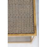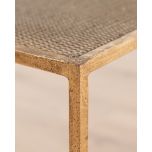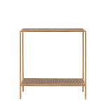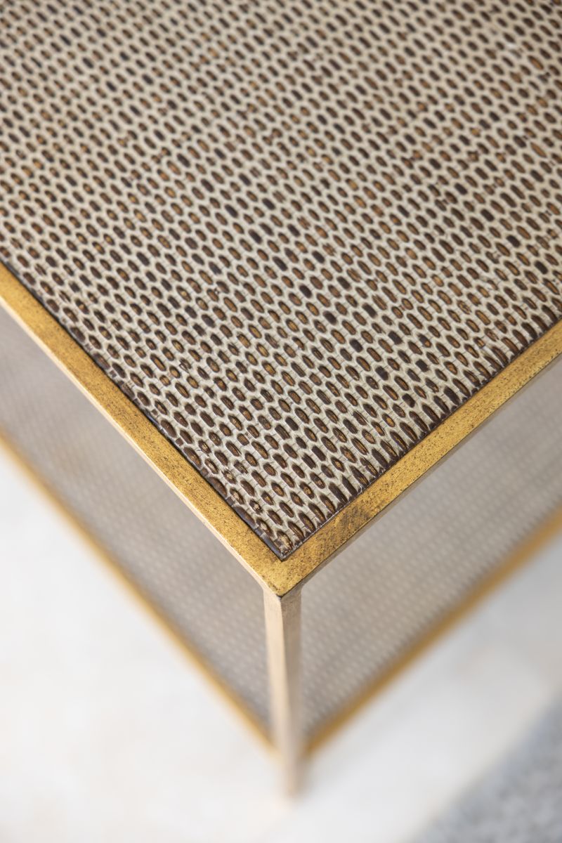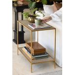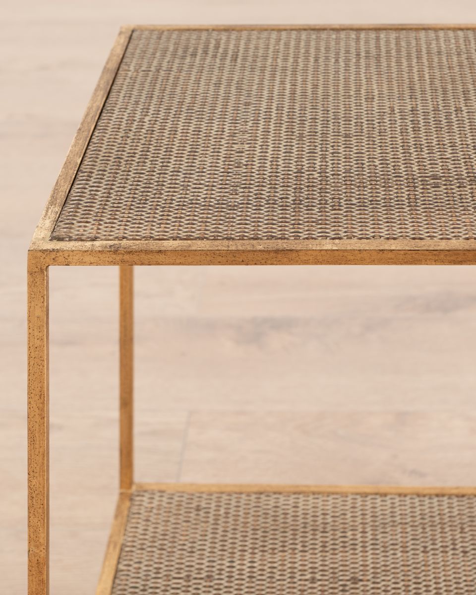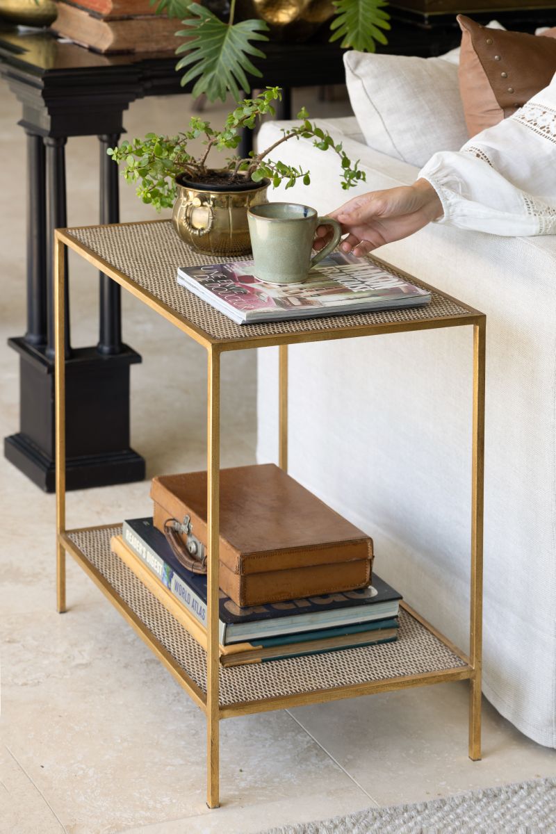 The Sardinia side table from the Villa collection is constructed with a metal frame, offering stability and durability while the rattan inlay on the bottom shelf introduces natural texture. Position this side table next to a neutral-toned sofa and adorn it with a statement lamp to highlight its gold accents. Complete the look with a few indoor plants nearby to enhance its natural charm.