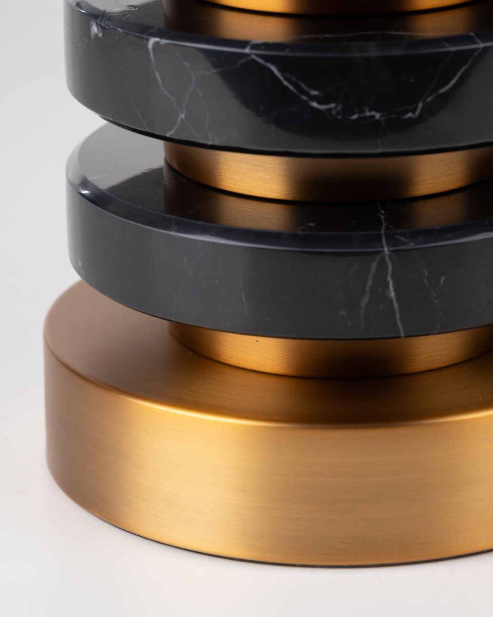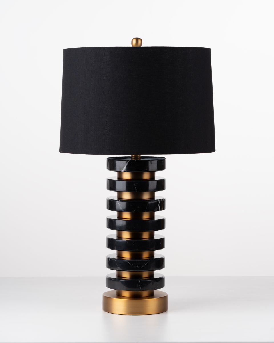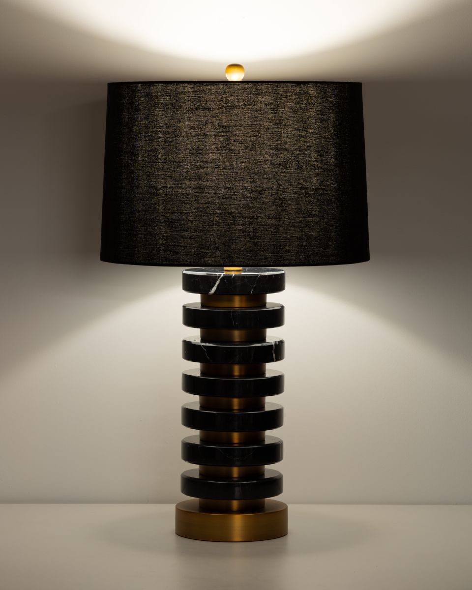 The Soho Lamp brings refined urban elegance to contemporary interiors. Its architectural base pairs layered black marble with warm metal detailing, creating contrast and visual rhythm. Finished with a black linen shade, the design casts a soft, atmospheric glow that adds depth and understated drama to any space.