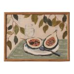 - Features a plate of ripe figs, a glass of water and cascading greenery in earthy tones and expressive brushstrokes