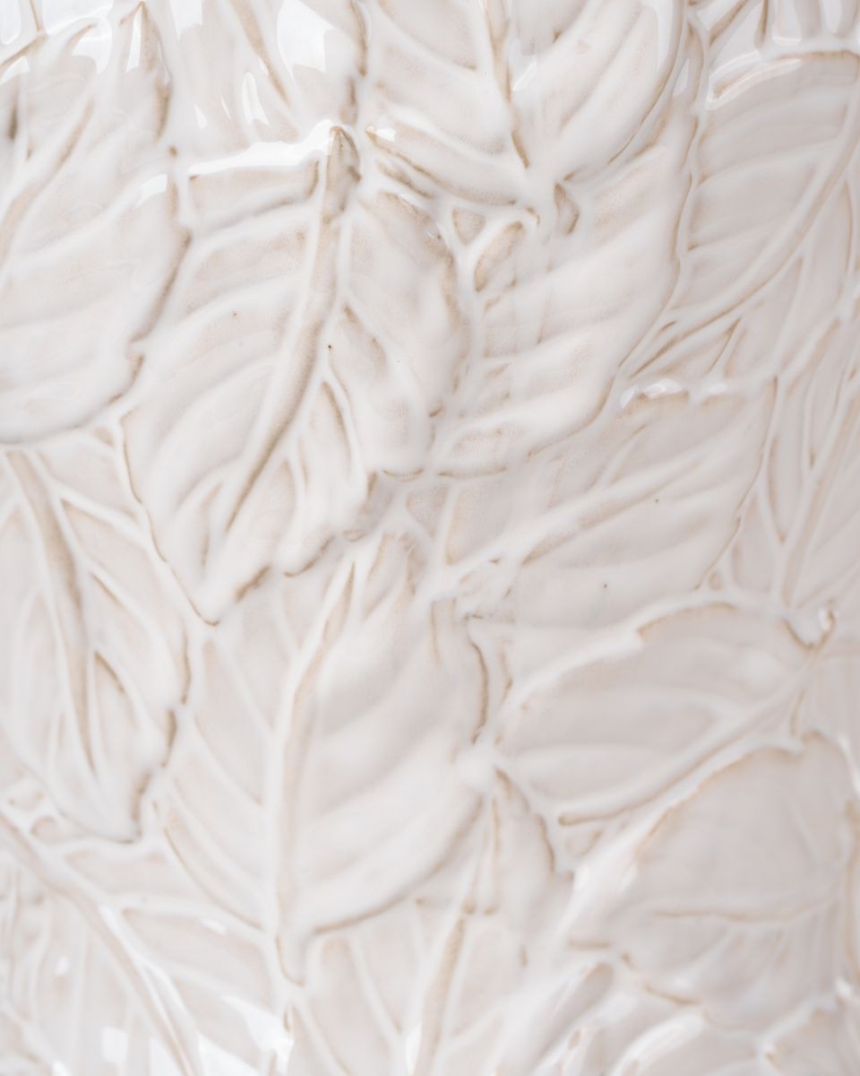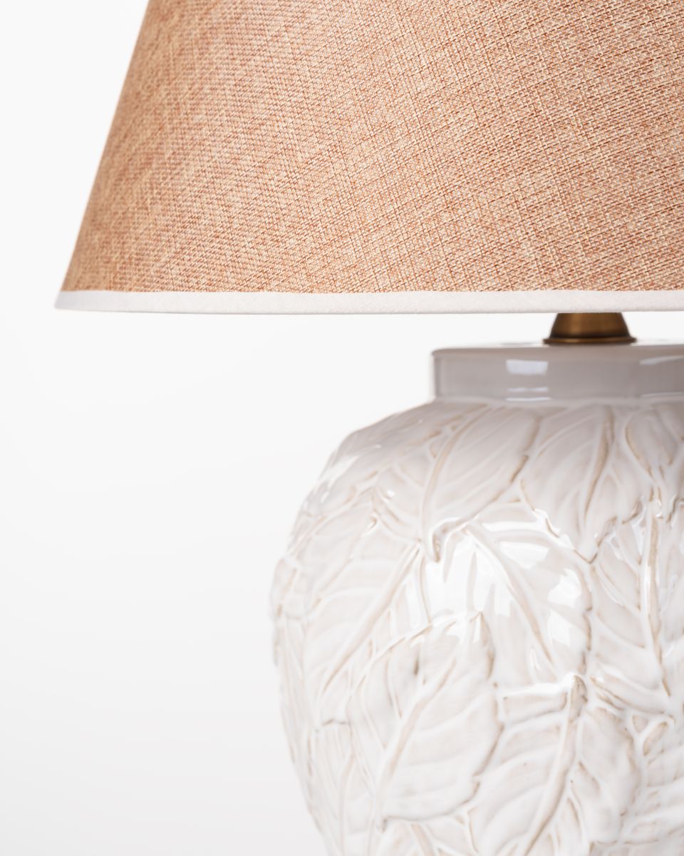 The Whispering Leaves Lamp brings natural artistry and soft sophistication into your home. Its ceramic base is adorned with an intricate sculpted leaf pattern, creating a gentle sense of movement as light and shadow play across the textured surface. Finished in a warm, neutral glaze, the base offers a timeless look that pairs beautifully with a variety of interiors.