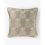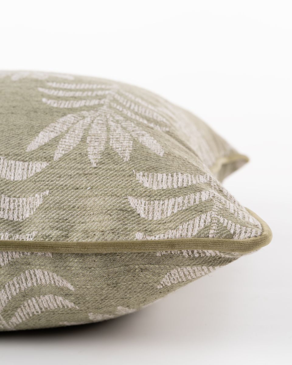 The cushion features a textured jacquard front and back, adorned with a repeating palm-inspired pattern in soft jade green and warm ivory. The intricate woven design adds depth and a gentle organic character, making it an elegant addition to both contemporary and classic interiors.