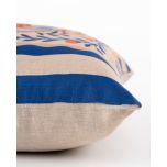 Set against a soft natural linen-look fabric, the rich hues of coral, blue, and warm neutrals create a striking yet relaxed aesthetic. The back is finished in a clean natural tone, ensuring easy styling across a variety of interior palettes. Filled with a premium feather inner, the cushion offers luxurious comfort with a beautifully full, inviting shape.