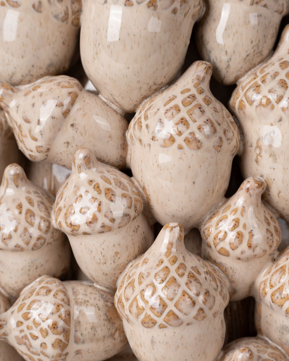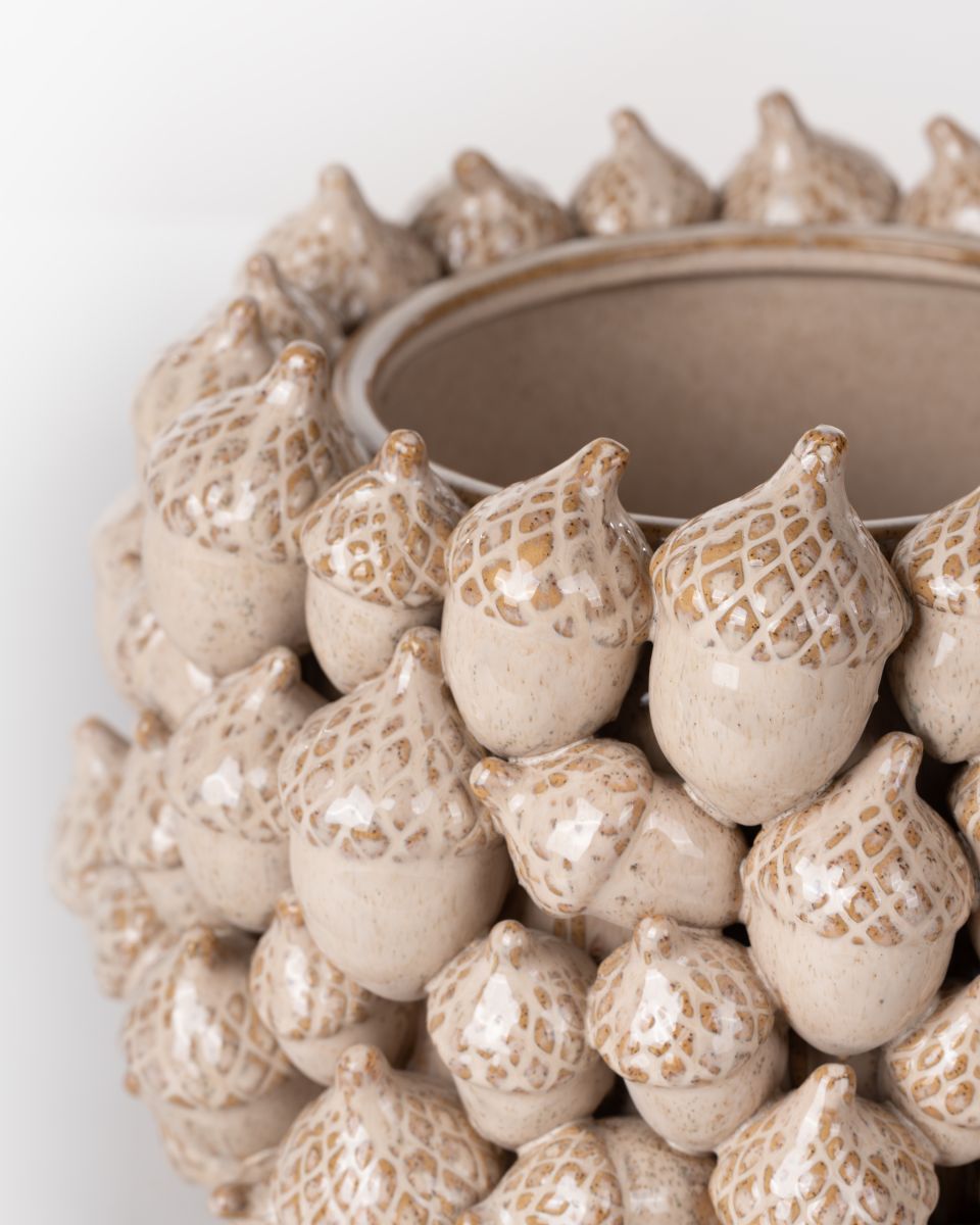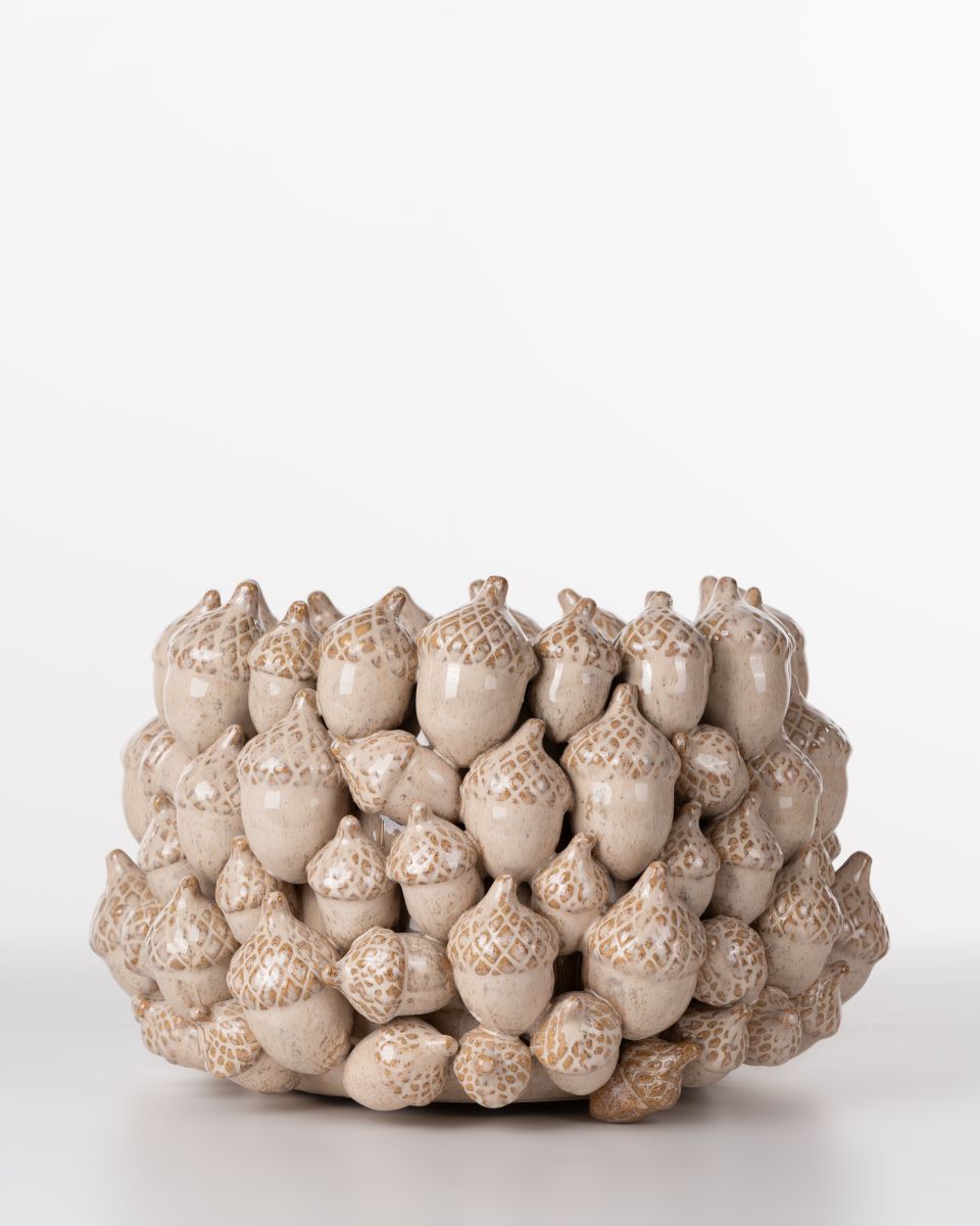 Bring a touch of woodland charm into your home with the Acorn Grove Planter. Meticulously crafted from ceramic, this standout piece features a sculptural cluster of hand-formed acorns, each finished in a warm, speckled glaze that adds depth and natural character. Its textured, organic silhouette makes it as much an art piece as it is a functional planter.