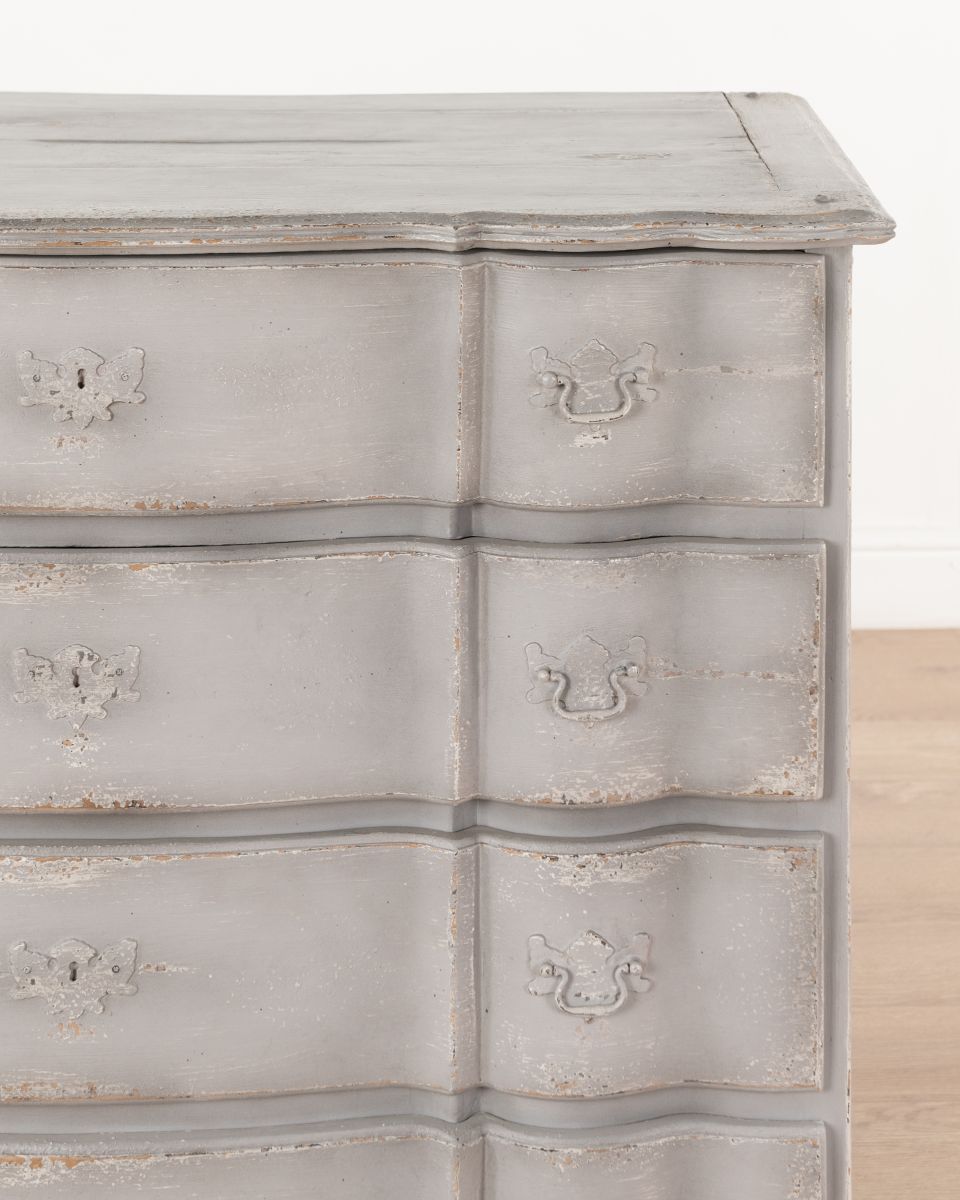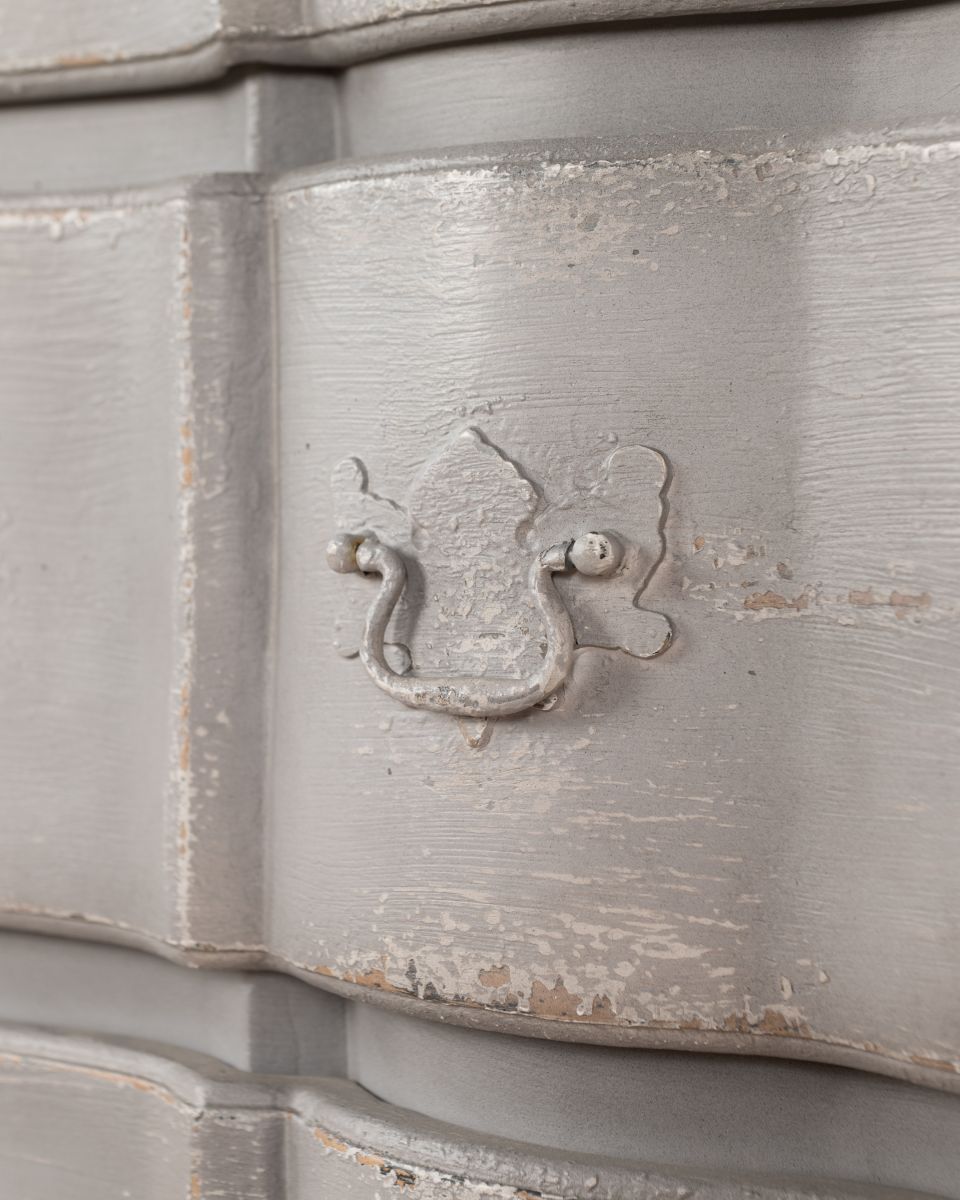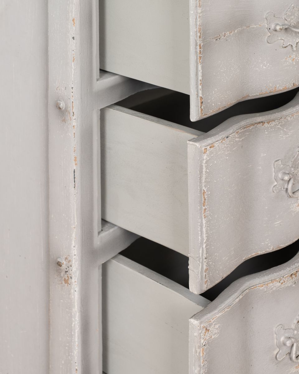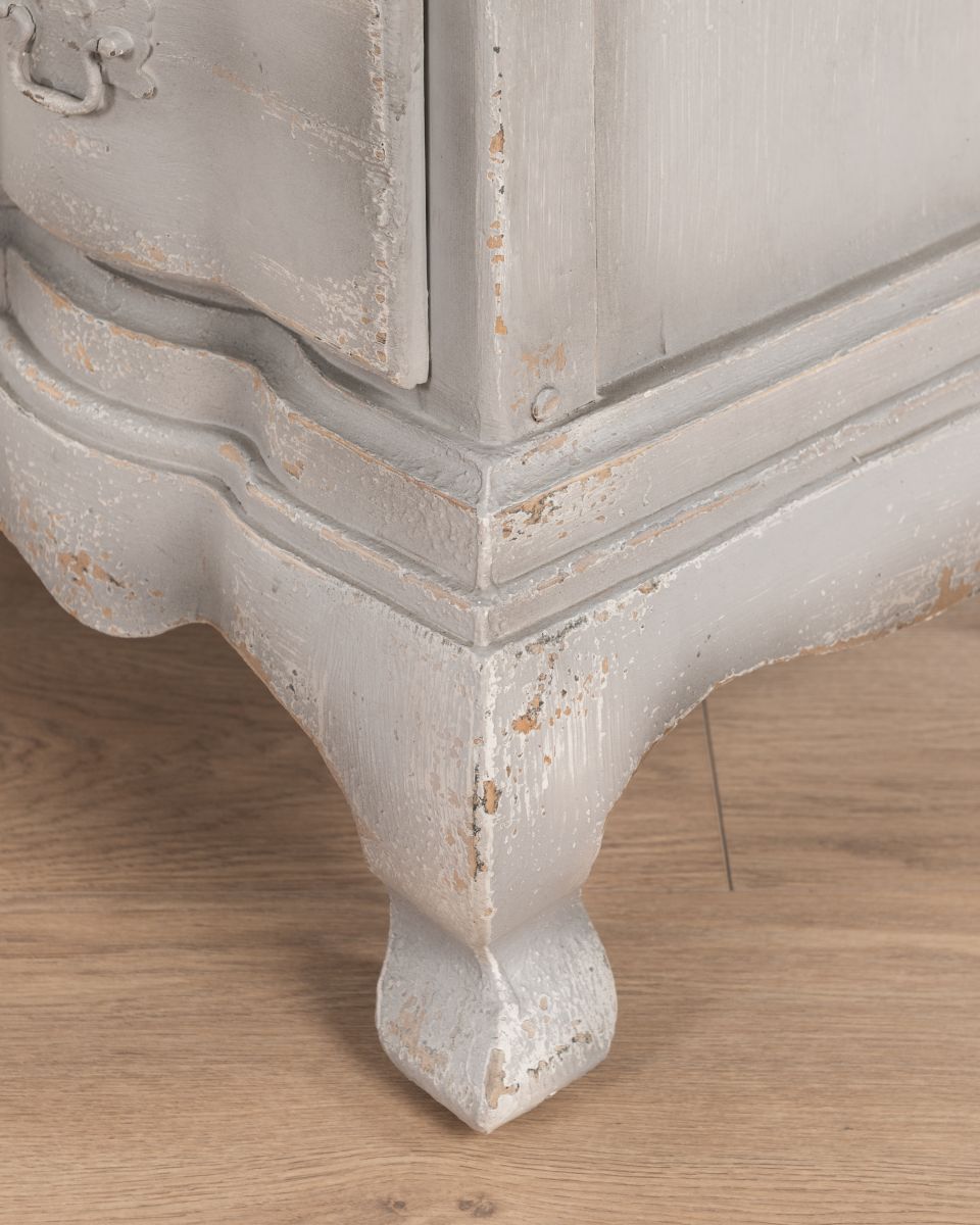 The Adriana chest of drawers from the Chateau collection offers practical storage with ornate detailing. Crafted from mindi wood with a grey finish, this piece is perfect for larger bedrooms as a bedside table or as a stylish TV stand. Pair with tall lamps or matching decor for a cohesive, elegant look.