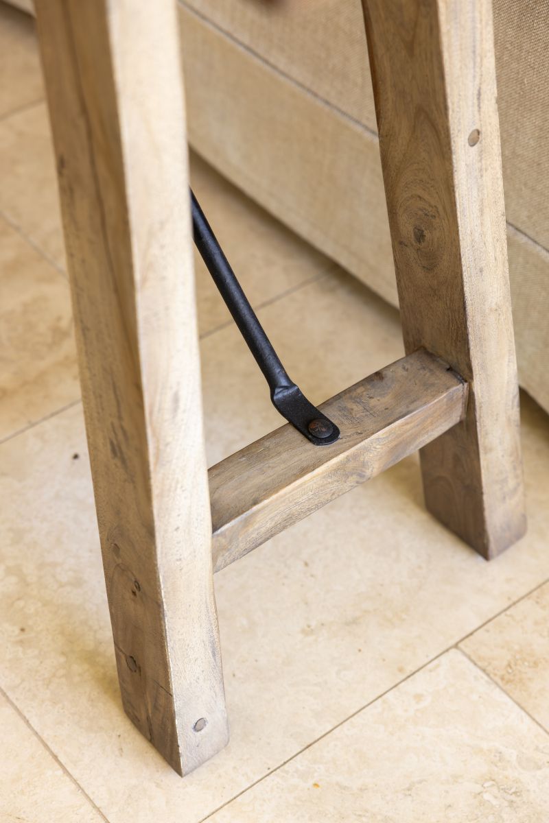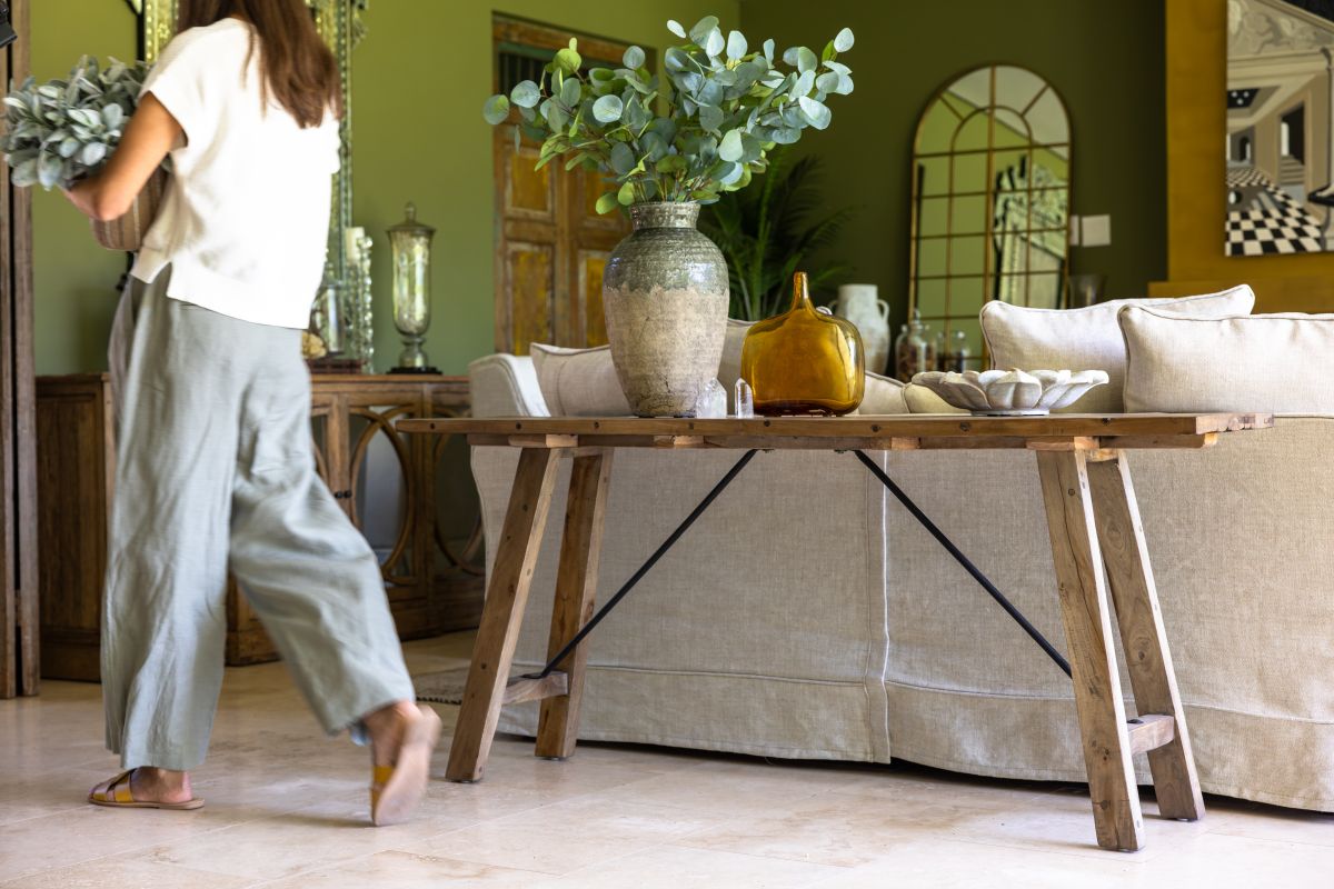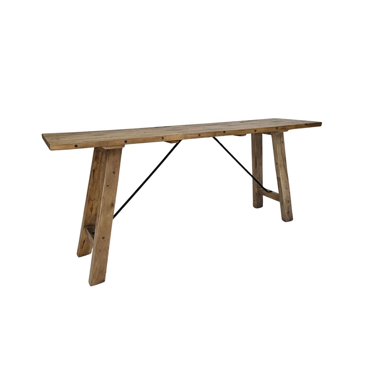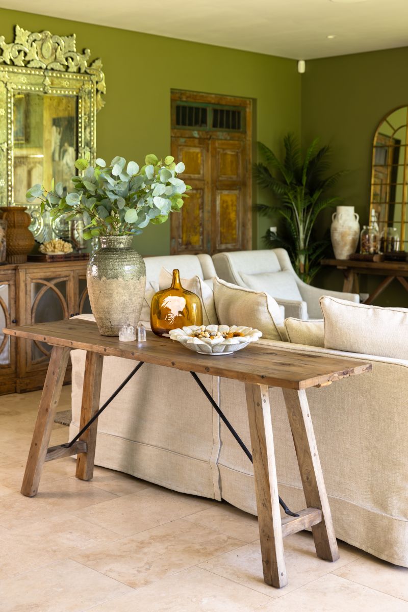 The Agate console table from the Villa collection showcases a robust finish on reclaimed boatwood, bringing character and history into any space. Architectural detailed legs make this piece a standout feature. Position this console table in an entryway or living room to create a captivating focal point. Complement its unique texture with an oversized mirror or bold artwork above, and add a few curated decor pieces for a personalised touch.