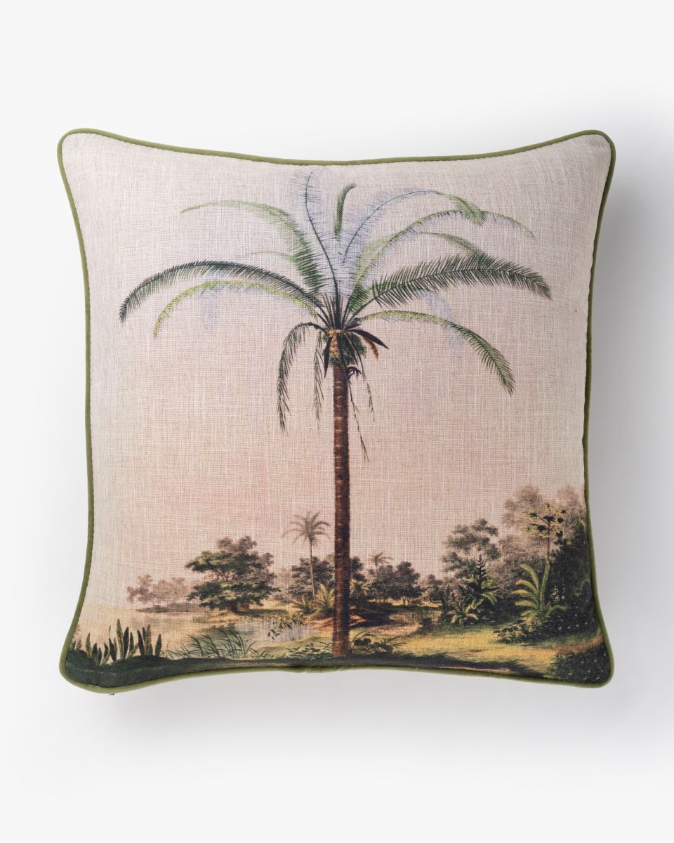 Capture the romance of old-world botanical art with the Antique Palm Cushion. Featuring a beautifully aged-style illustration of a slender palm rising above a softly rendered landscape, this cushion brings a sense of serenity and timeless charm to any interior. The muted palette of greens, earthy tones, and warm neutrals enhances the vintage aesthetic while remaining effortlessly versatile.