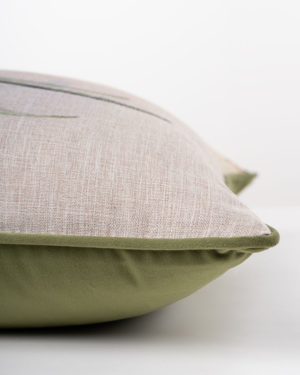 Printed on a textured linen-look front, the artwork feels organic and tactile, echoing the character of traditional naturalist sketches. The cushion is finished with a plush velvet backing in a soft moss green, adding richness, warmth, and luxurious texture. A piped edge frames the design for a refined, classic finish, while the premium feather inner ensures lasting comfort and a beautifully full, inviting form.