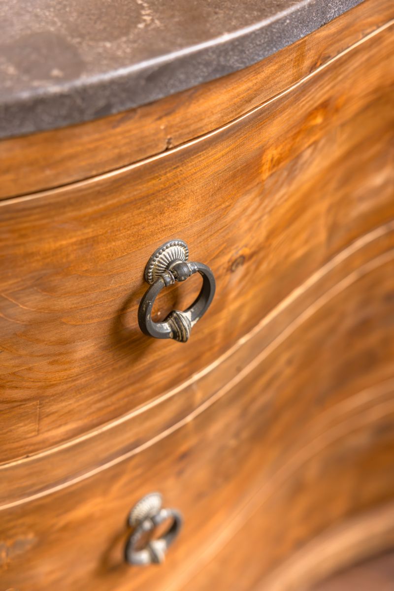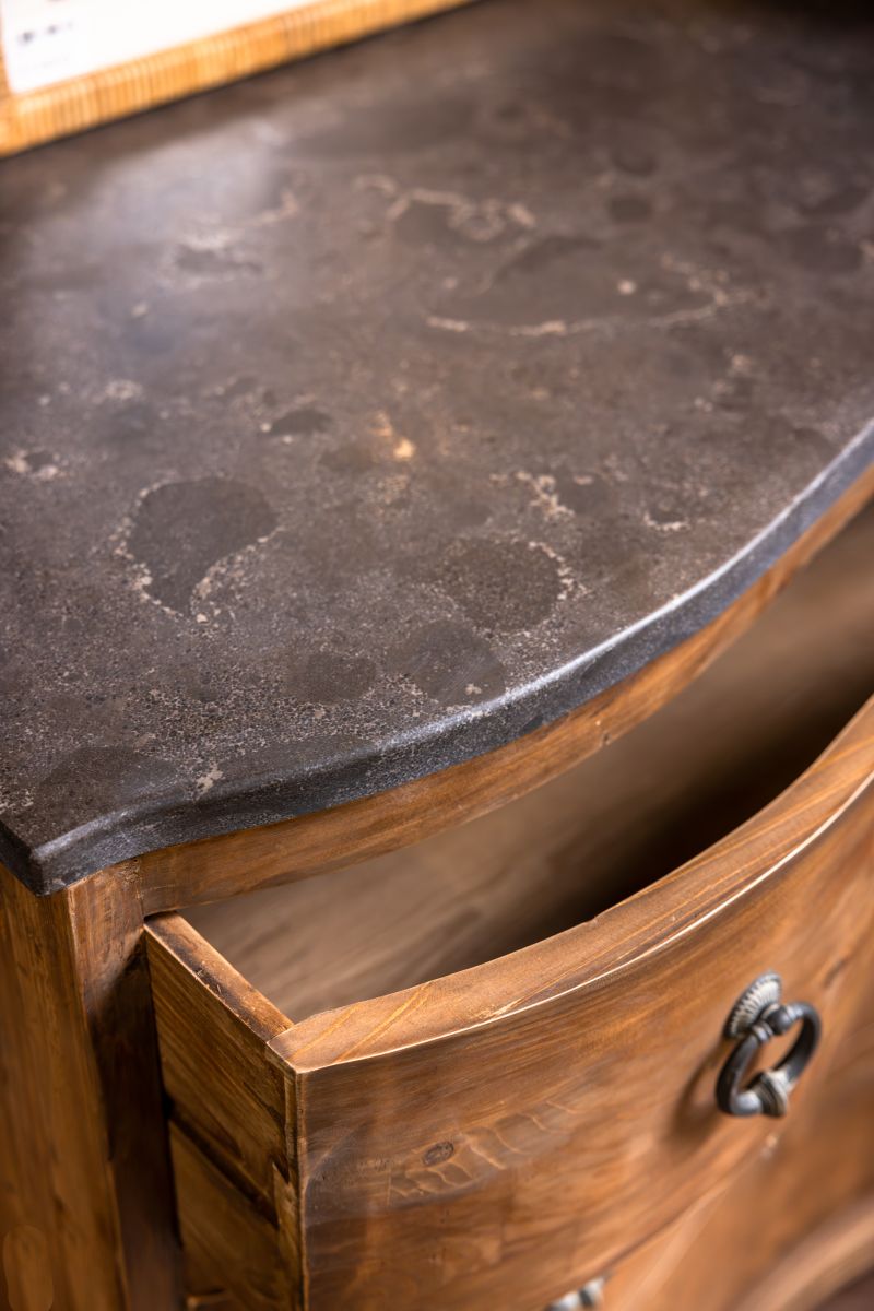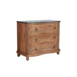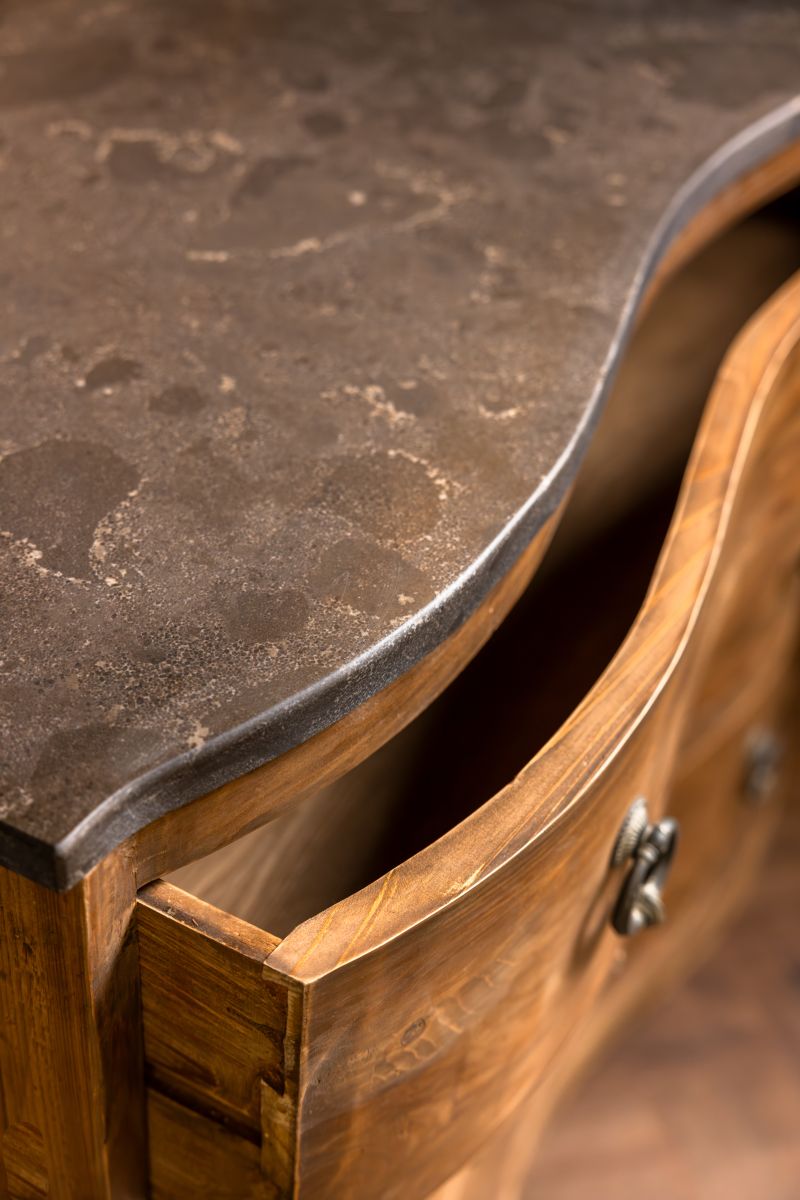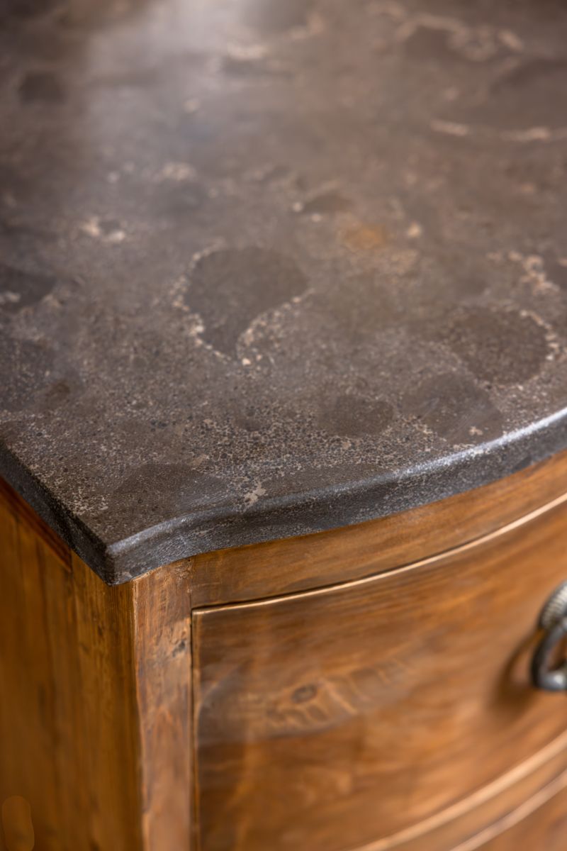 The Antoine chest of drawers from our Chateau collection embodies timeless French elegance with a modern twist. Crafted from old pine, its raw, pale wood offers a warm, inviting contrast to the sleek, scalloped blue stone top. Classic bun feet add sophistication, making it a versatile piece perfect for any setting. Whether gracing your bedroom beside a grand bed, serving as a focal point in your lounge, or welcoming guests in your entrance hall, the Antoine chest is both functional and stylish. Its generous size also makes it ideal as a sideboard, beautifully complemented by a mirror or painting above it.