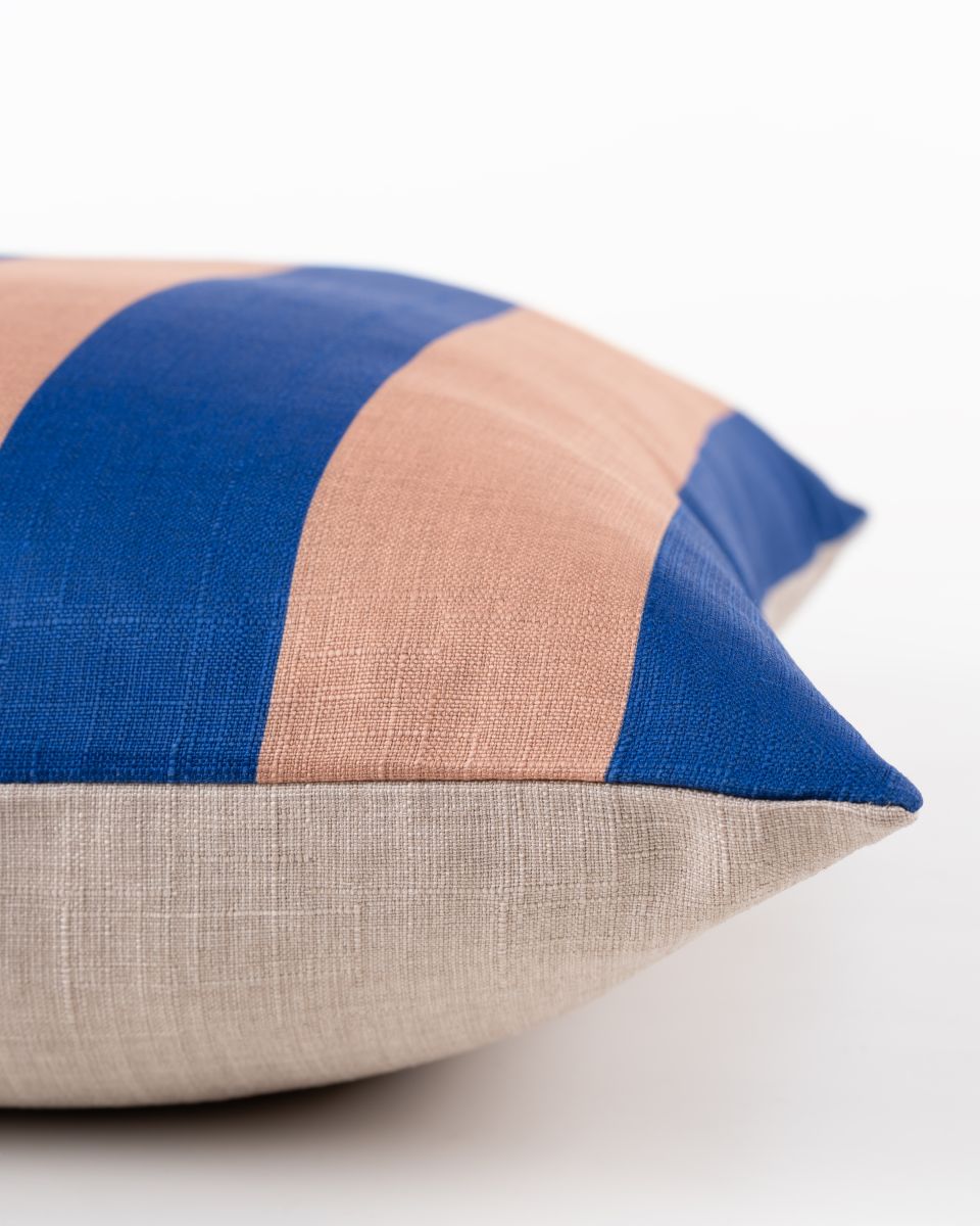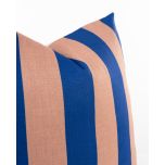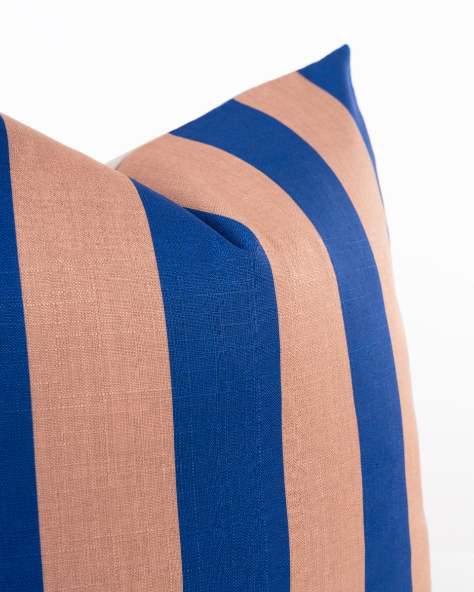 Bring crisp, coastal simplicity into your space with the Azure Cabana Stripe Cushion. Featuring bold azure blue and warm blush-toned cabana stripes, this design adds a modern Mediterranean freshness to any room. The clean vertical stripe pattern creates a sense of height and structure, making it a perfect companion for both patterned and solid cushions.