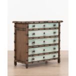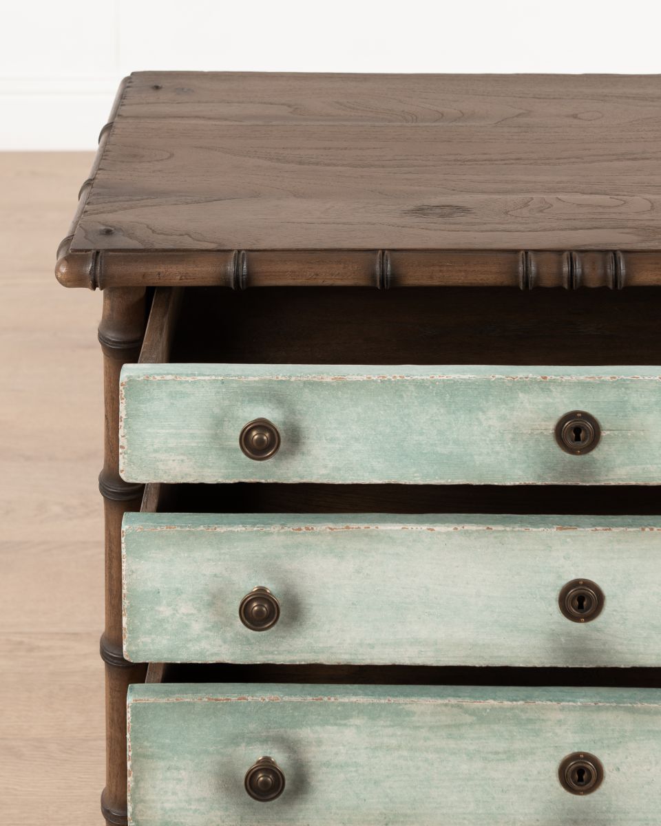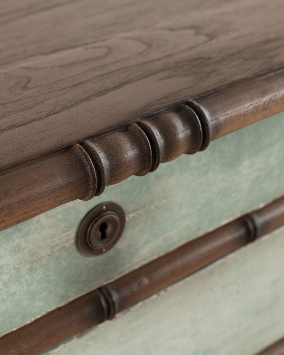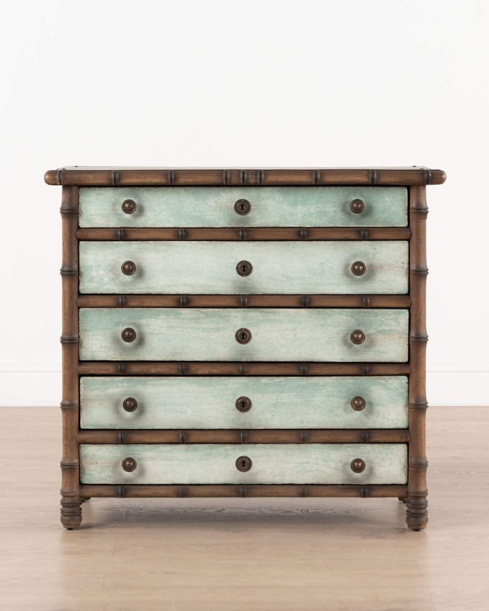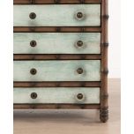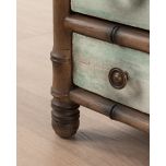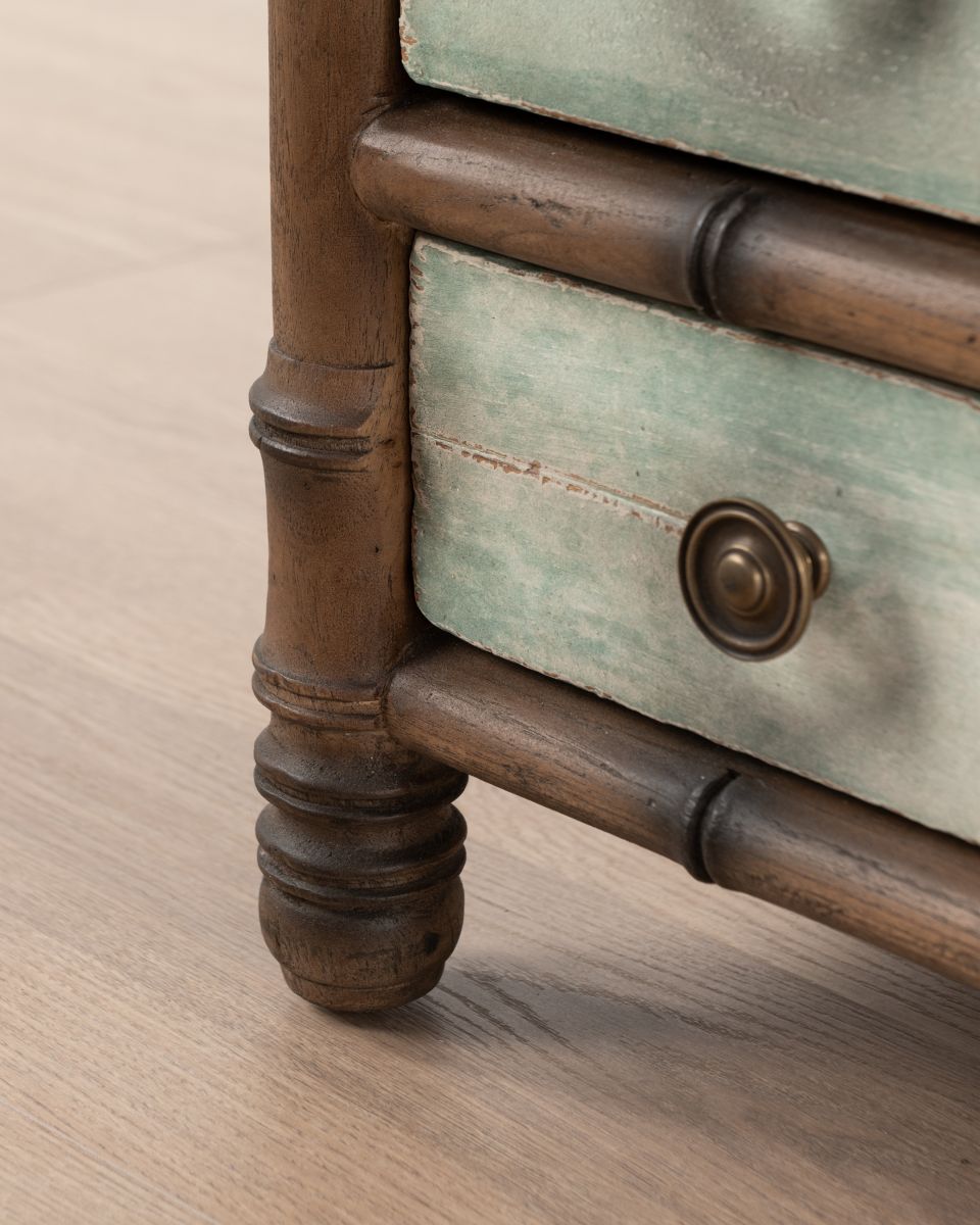 Add a Palm Beach feel to your space with the Baia chest of drawers. Featuring bamboo-style edging and pistachio-painted drawers, this piece is designed to bring character and a pop of colour to any space. Crafted from durable mindi wood, it boasts five spacious drawers for practical storage. Ideal as large bedside tables or for adding a coastal cool touch to an office or bedroom.