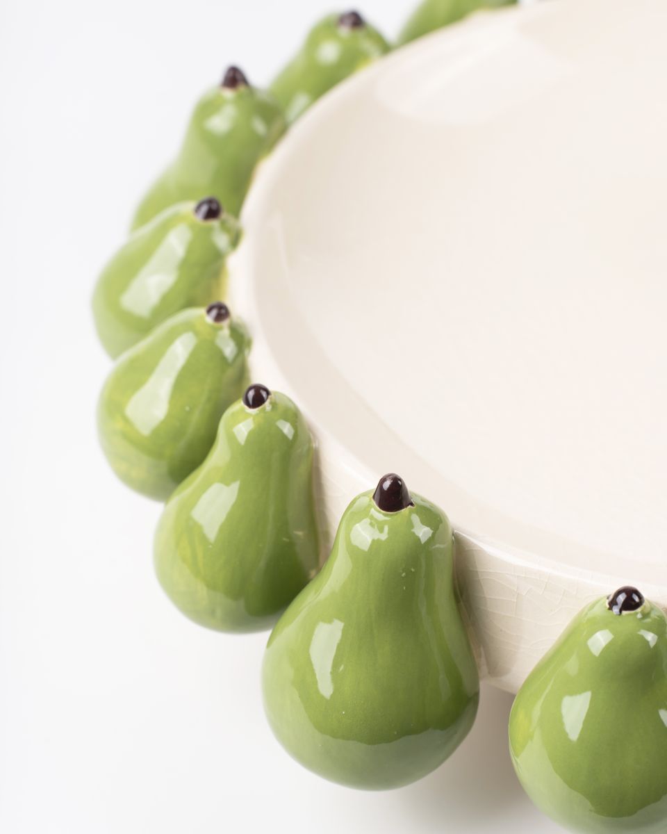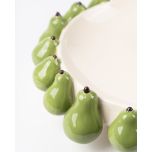 - Features a ring of sculpted green pears around its rim